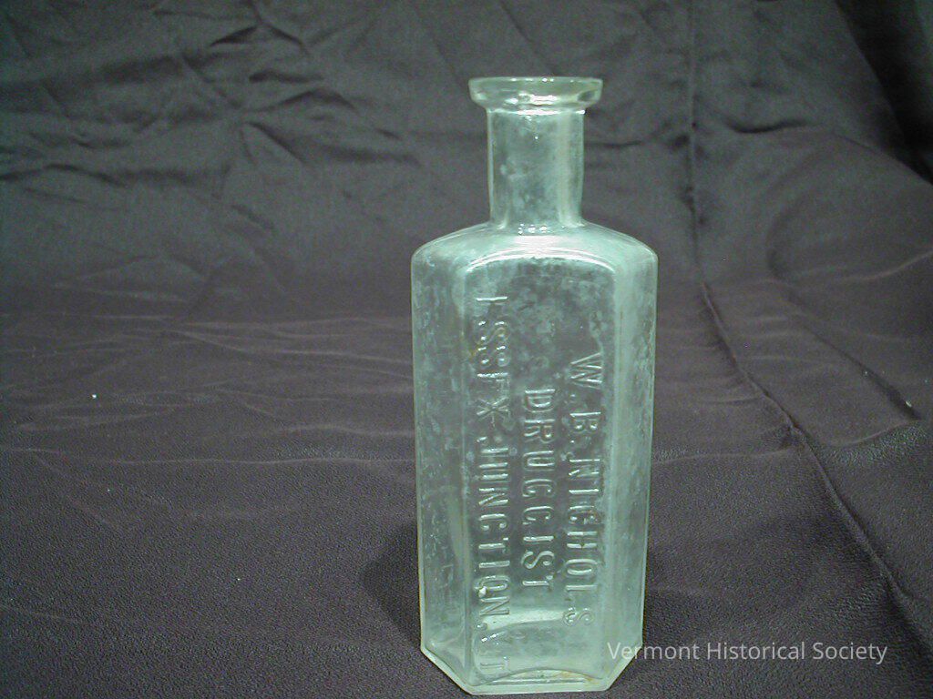 Clear glass medicine bottle with the molded inscription, "W.B. NICHOLS DRUGGIST ESSEX JUNCTION, VT."