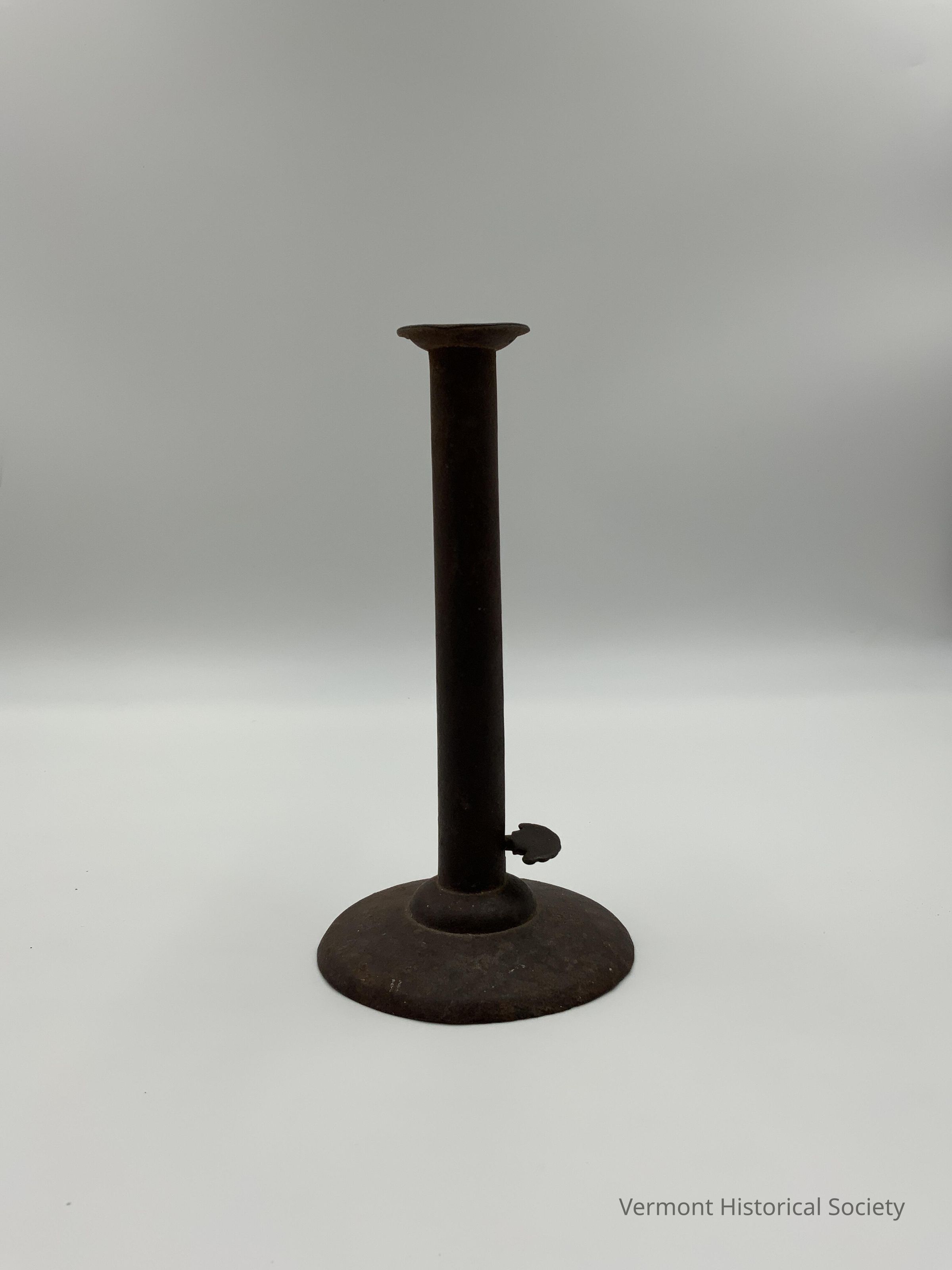 Straight tin candlestick with a round base. There is a tab on the side for raising the candle.
