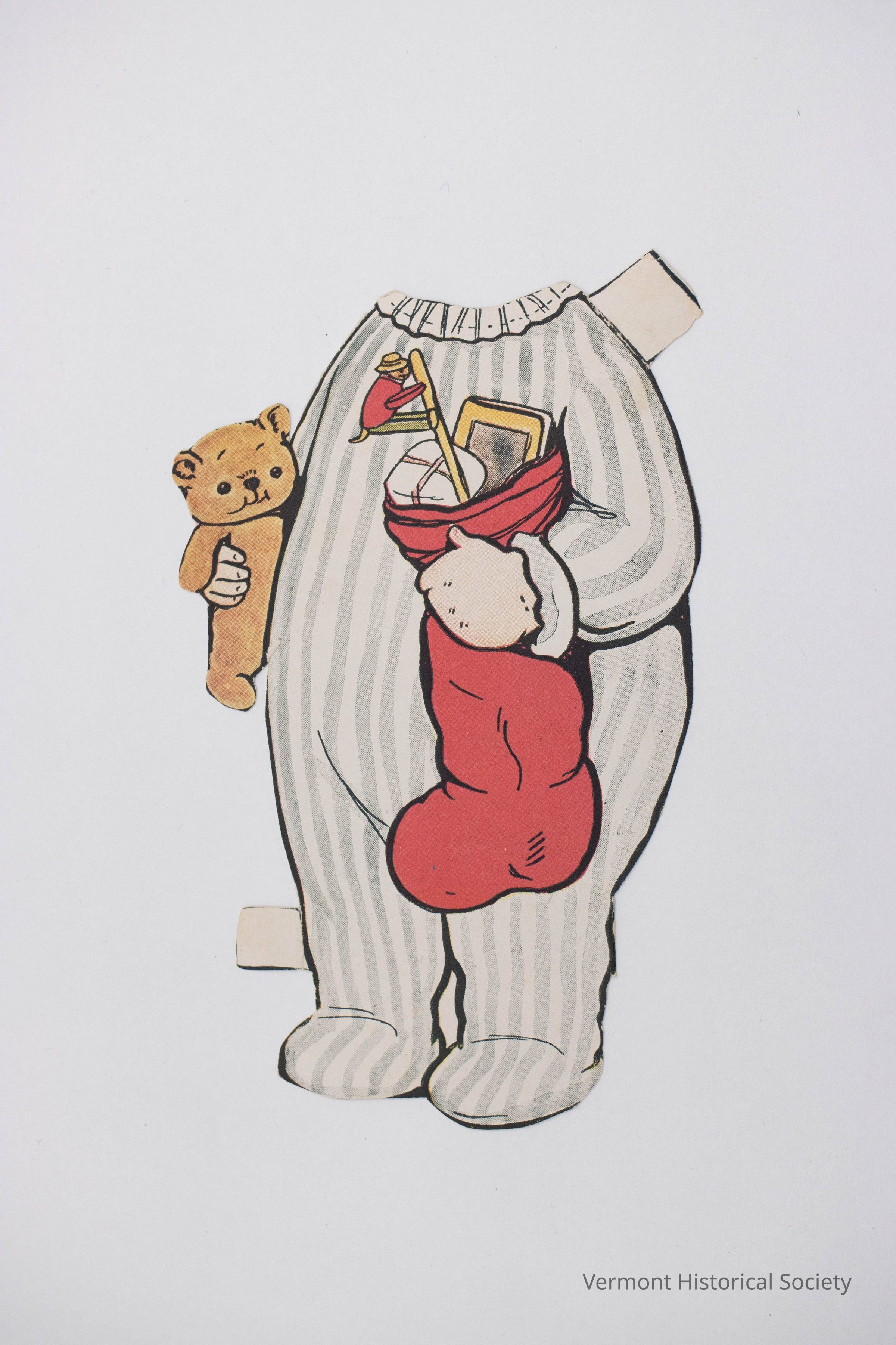 Printed paper pajama suit for a paper doll. The outfit consists of blue-and-white striped full-body pajamas. One arm is holding a teddy bear and the other arm is holding a long red stocking filled with toys. The back shows a portion of a sales catalog page.Context
