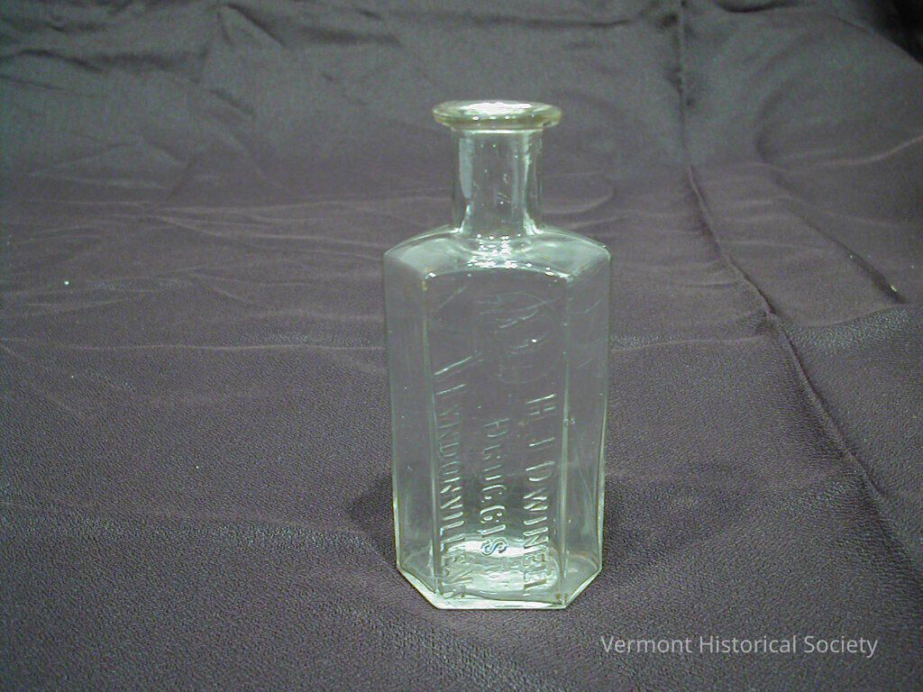 Clear glass medicine bottle with the molded inscription, "H.J. DWINELL/ DRUGGIST/ LYNDONVILLE, VT." Near the shoulder is the molded image of fan with the initial D in the center. The bottom is molded with the date, "MAY 15, 88".Context