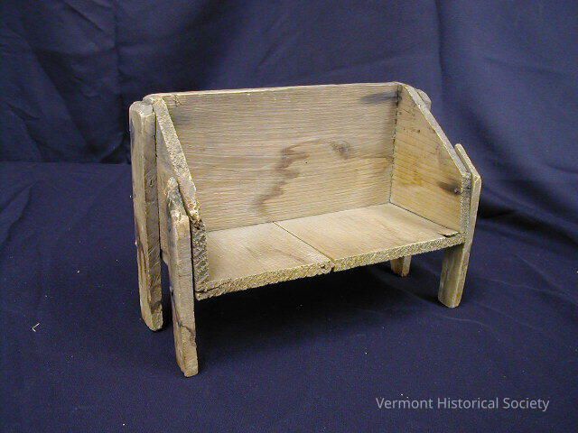 Wooden doll bench. The bench is made from a corner of a box with two boards nailed to each side to form legs. The back of the bench reads, "Gibraltar Horse Nails. 25 lbs. No. 6".Context
