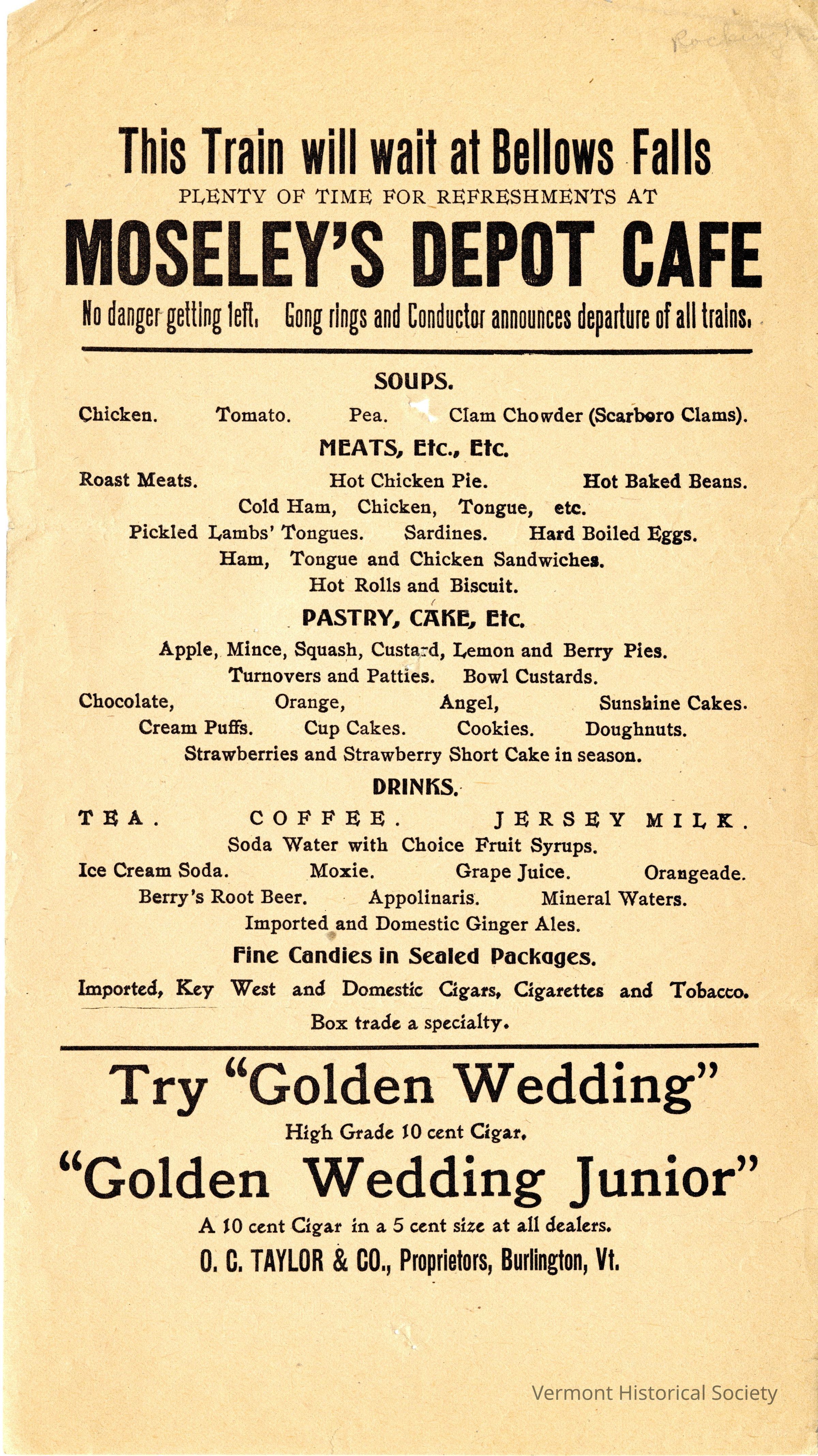 Menu for Moseley's Depot Cafe at the Bellows Falls train station