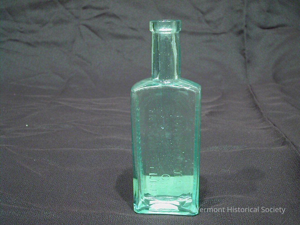 Clear glass medicine bottle with the molded inscription, "BANCROFT'S LINIMENT OR INSTANT RELIEF" on the front, "MARSHFIELD, VT." on one side, and "D.W. BANCROFT" on the other side.Context