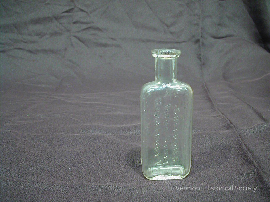 Clear glass medicine bottle with the molded inscription, "SHELDON'S DRUG STORE, MIDDLEBURY, VT." The bottom has the inscription, "PAT. JAN 5, 1892".Context