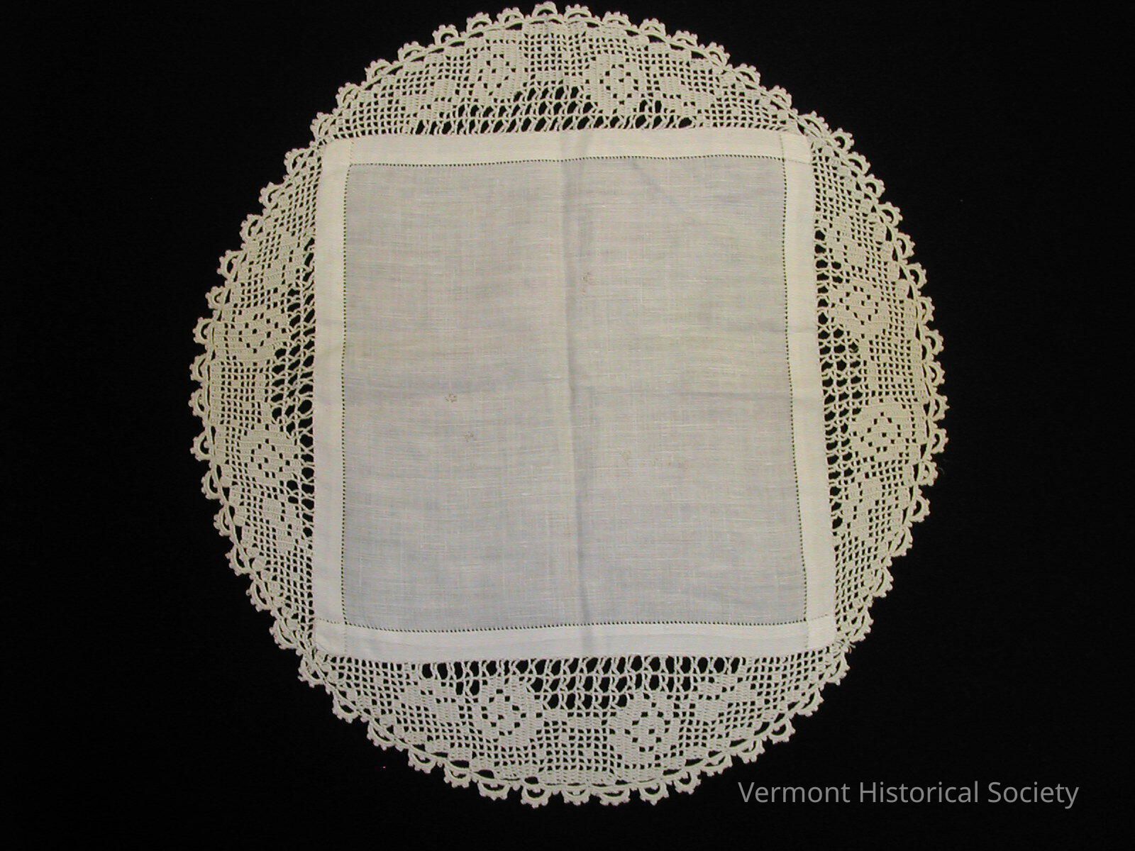 Round doily with a square, plain-woven cotton center. The edges are crocheted in semi-circular wedges, each with a design of roses.Context