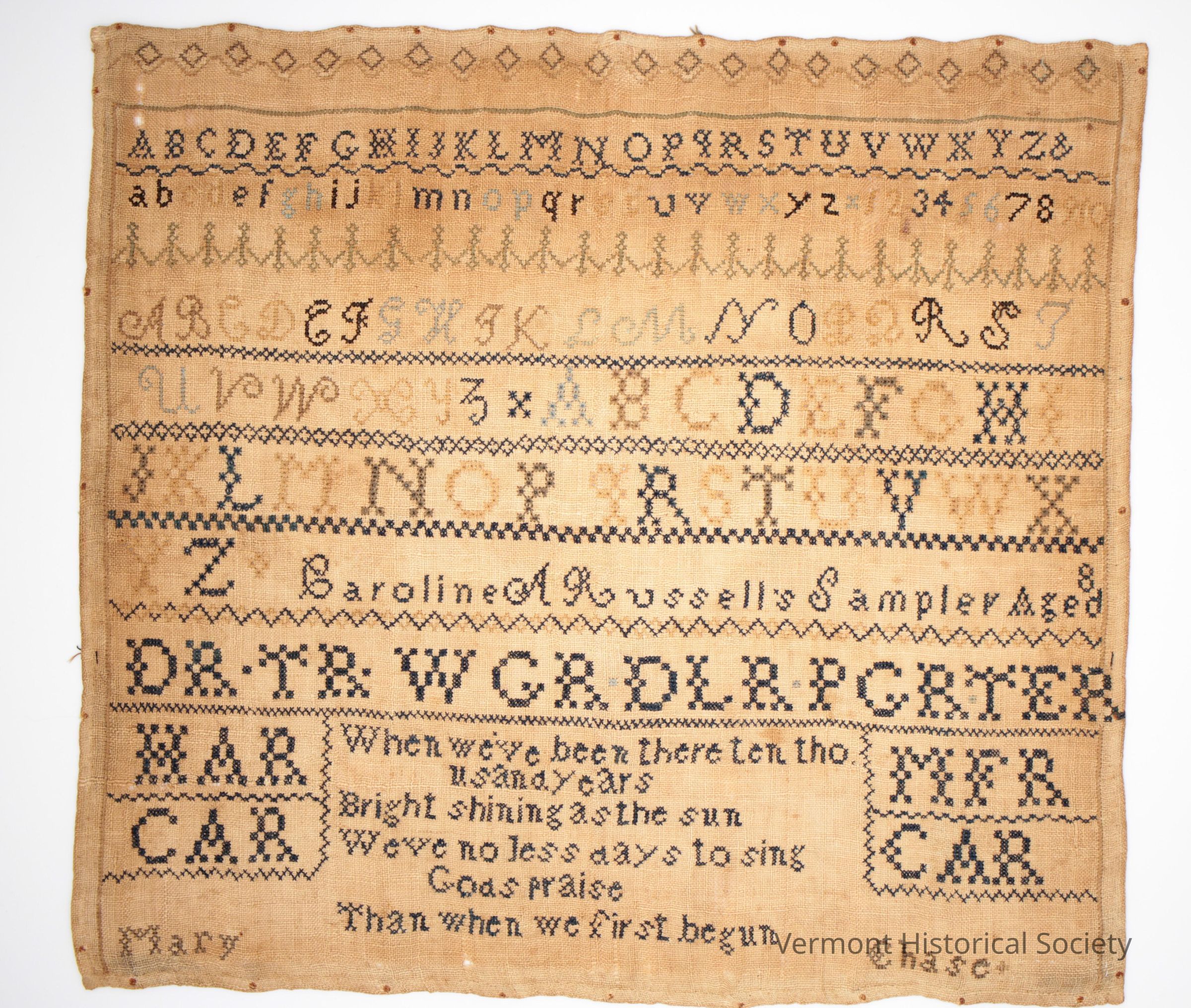 Alphabet sampler stitched on undyed linen with black, brown, blue, and green thread in cross stitches and eyelet stitches. The top has a border of diamonds above a horizontal curvilinear line. A capital marking alphabet with the & symbol at the end is the first line, followed by a lower-case marking alphabet along the second line. Then there is a decorative border. Beneath the border are two more alphabets: script capitals, and eyelet marking capitals. Then, approximately at the center, is the inscription, "Carolin A Russell's Sampler Aged 8" followed by "DR . TR . WGRDLRPGRTER / HAR / CAR / MFR / CAR" and the verse, "When we've been there then thousand years/ Bright shining as the sun/ Weve [sic] no less days to sign Gods praise/ Than when we first begun". The name "Mary Chase" is in the lower corners.Context