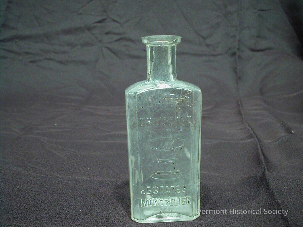 Clear glass medicine bottle. The bottle has rectangular in shape, with a tall neck and flared lip. The front of the bottle has the molded inscription, "L.H.GREENE / DRUGGIST / 25 STATE ST. / MONTPELIER,VT." around an image of a mortar and pestle in the center.Context