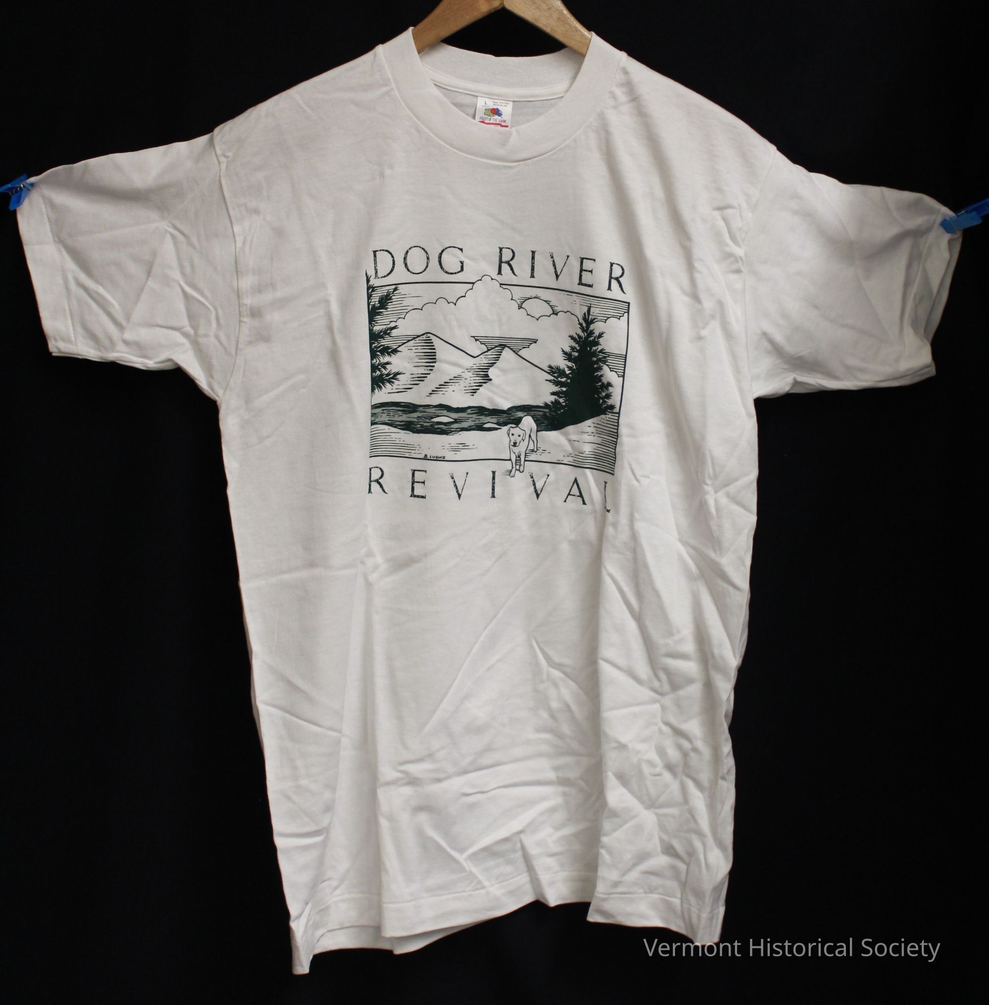 White cotton jersey-knitted t-shirt. The front is printed in black with a scenic image showing a dog standing in a landscape consistings of trees, sky, a body of water, and either mountains or pyramids, with the words, "DOG RIVER REVIVAL". The back is printed in black with logos for Cabot Hosiery Mills, Northfield Savins Bank, Chouinard, Ace Hardward, F.E.E.L., Benn & Jerry's, TDS Telecom, Vermont Pure Springs, Inc., The Morning Glory Flower Shop. The logos surround a large recycling icon, and the words, "Helping To Clean The Dog In 1995", run along the bottom.Acquisition