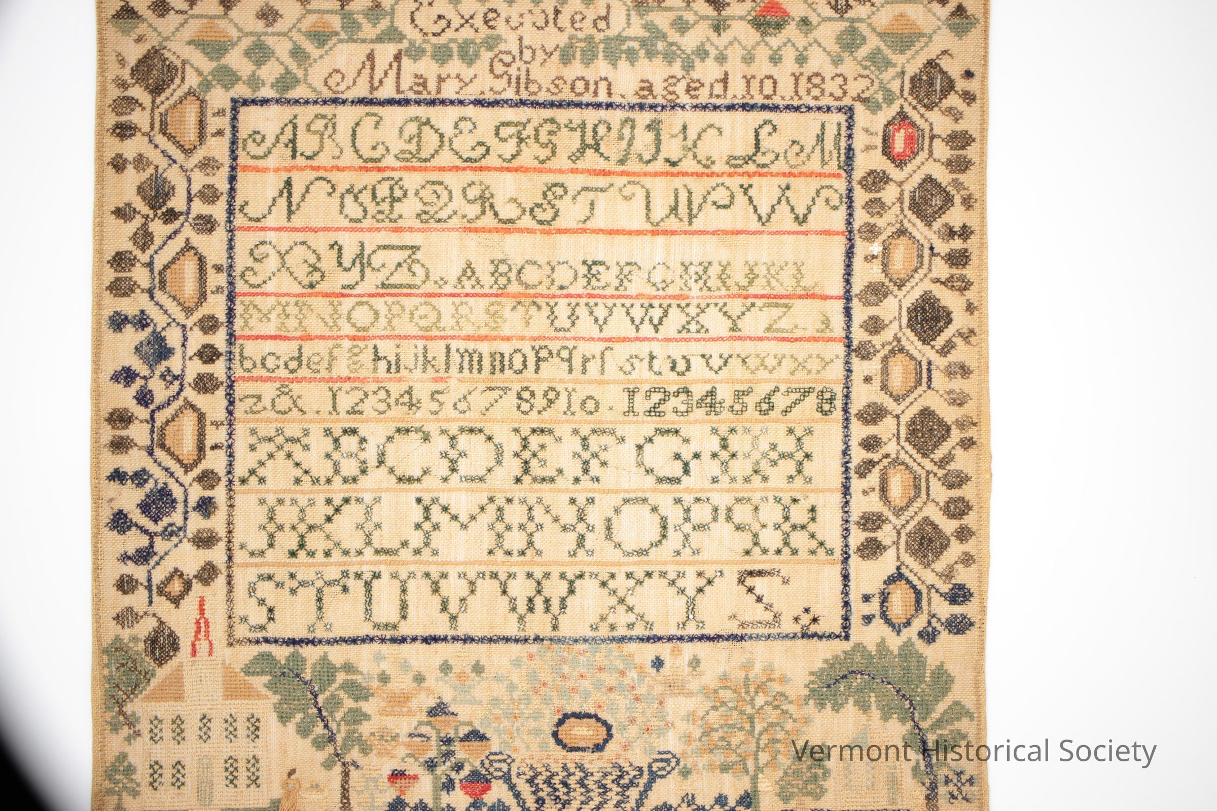 Linen sampler with floral border, pictorial elements on the bottom, and multiple alphabets. Along the top edge is the inscription: "Executed/ Mary Gibson aged 10, 1832." The border is a variation on the strawberry vine, stitched in blue, brown, green, red, and yellow. The top alphabet is an uppercase Italianate script in green cross stitch. The second alphabet is capitalized marking stitches in green cross stitch, followed by a lowercase marking script in green cross stitches with numbers up to ten. Followed by numbers up to eight in green box stitch. The third alphabet is Germanic marking stitches in green eyelet stitches. The images on the bottom of the sampler depict a church, trees, a woman, flowers, a strawberry plant, a bouquet in a basket, and a small building in cross stitches (the woman is embroidered). It was previously mounted but removed. The red, brown, light green, and blue threads are wool. The dark green and one of the tan colors are silk.Context