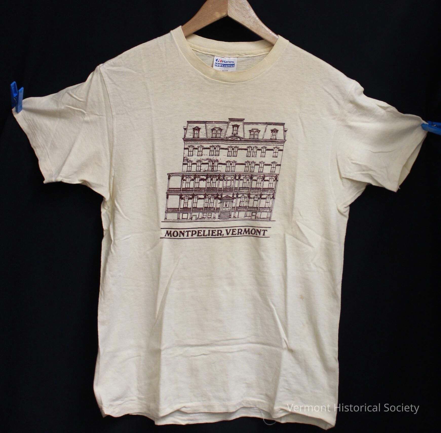 Cream-colored t-shirt printed in brown with a line drawing illustration of the Pavilion Hotel and the label, "MONTPELIER, VERMONT".