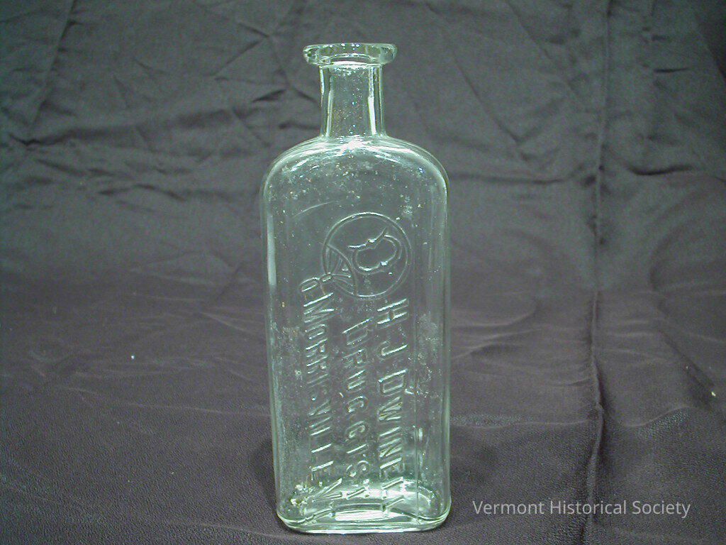 Clear glass medicine bottle with the molded inscription, "H J DWINELL DRUGGIST MORRISVILLE, VT." Above the inscription is the molded image of a hand fan with the initial D on it.