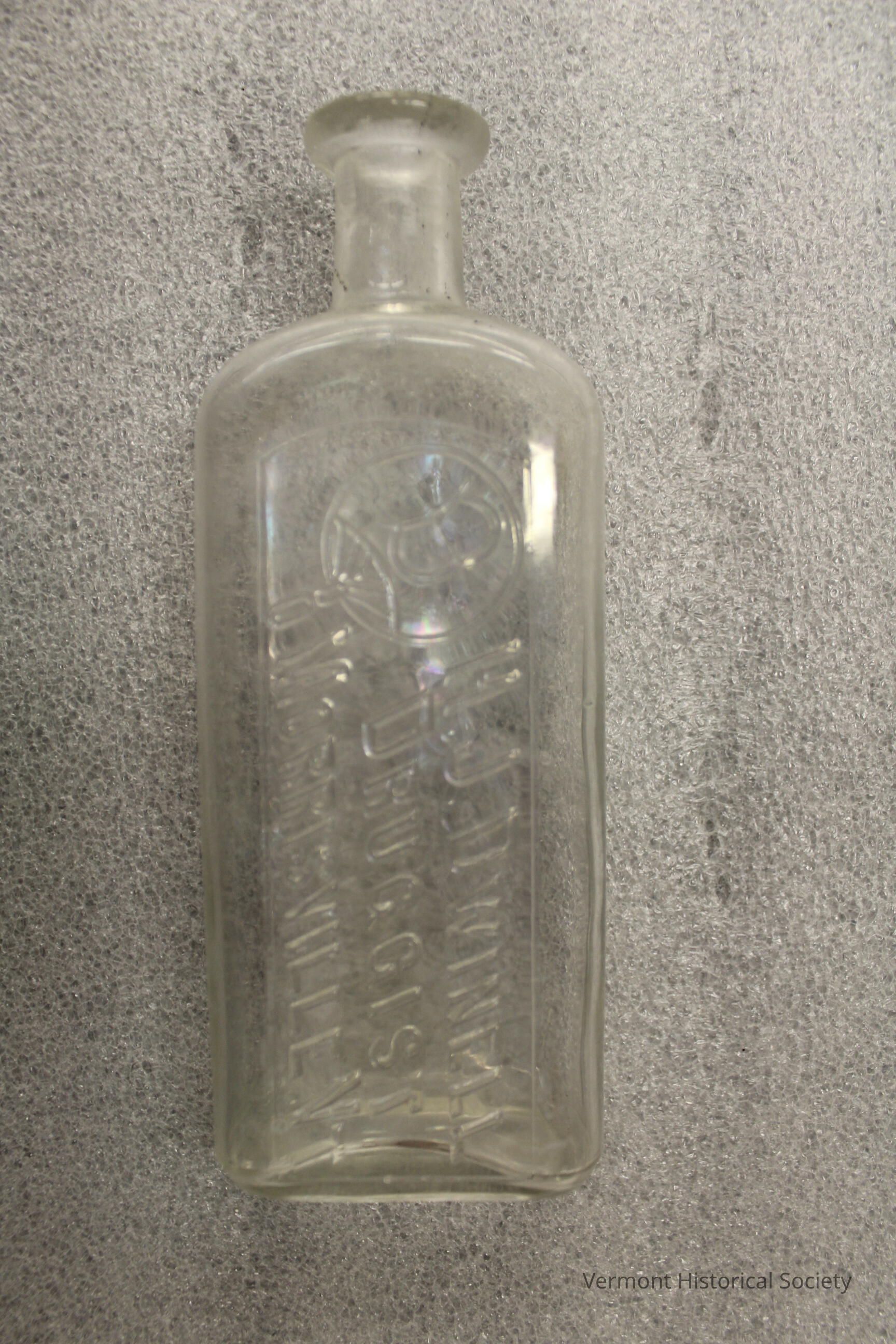 Clear glass medicine bottle with the molded inscription, "H J DWINELL DRUGGIST MORRISVILLE, VT." Above the inscription is the molded image of a hand fan with the initial D on it.