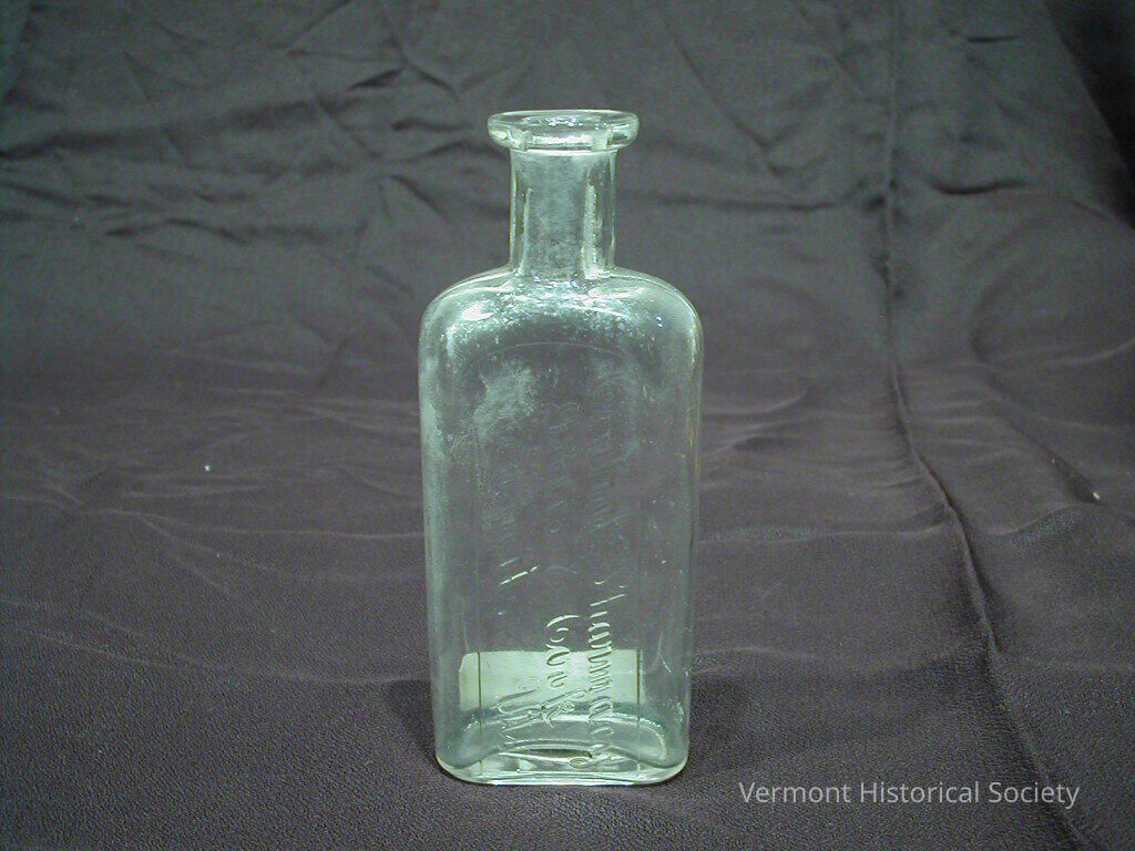 Clear glass medicine bottle with the molded inscription, "Central Pharmacy Davis & Cook Newport, Vt."