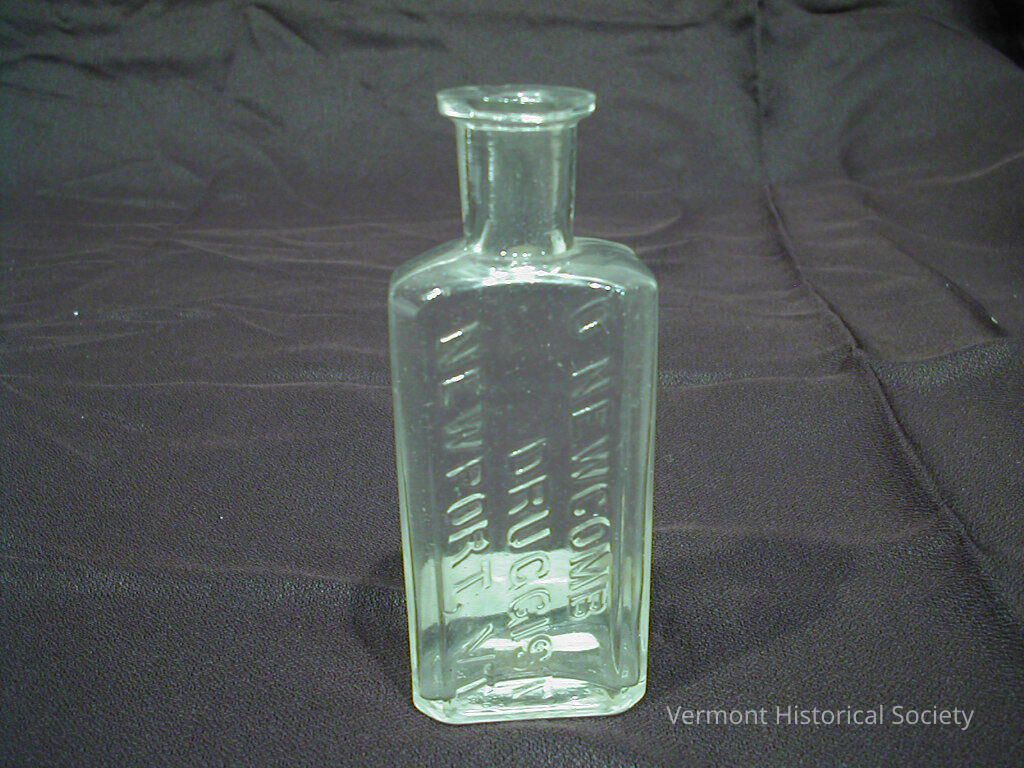 Clear glass medicine bottle with the molded inscription, "O. NEWCOMB DRUGGIST NEWPORT, VT." The bottom has the label, "DEC 13, 8".Context