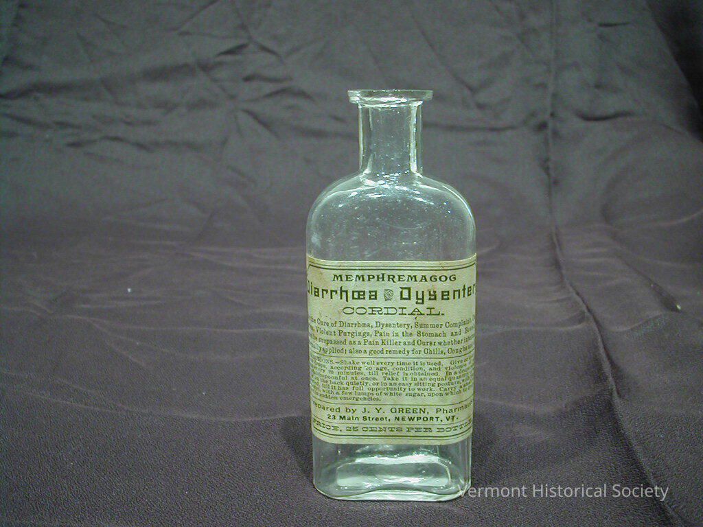 Clear glass medicine bottle with a paper label that says, "MEMPHREMAGOG Diarrhaea [sic] Dysentery CORDIAL. [Further uses and instructions included.] Prepared by J.Y. GREEN, Pharmacist, 23 Main Street, NEWPORT, VT. PRICE, 25 CENTS PER BOTTLE." The other side of the bottle has the molded inscription, "EST. 1863 J.Y. GREEN'S PHARMACY 23 MAIN ST. NEWPORT, VT." with the molded image of a mortar and pestle.Context