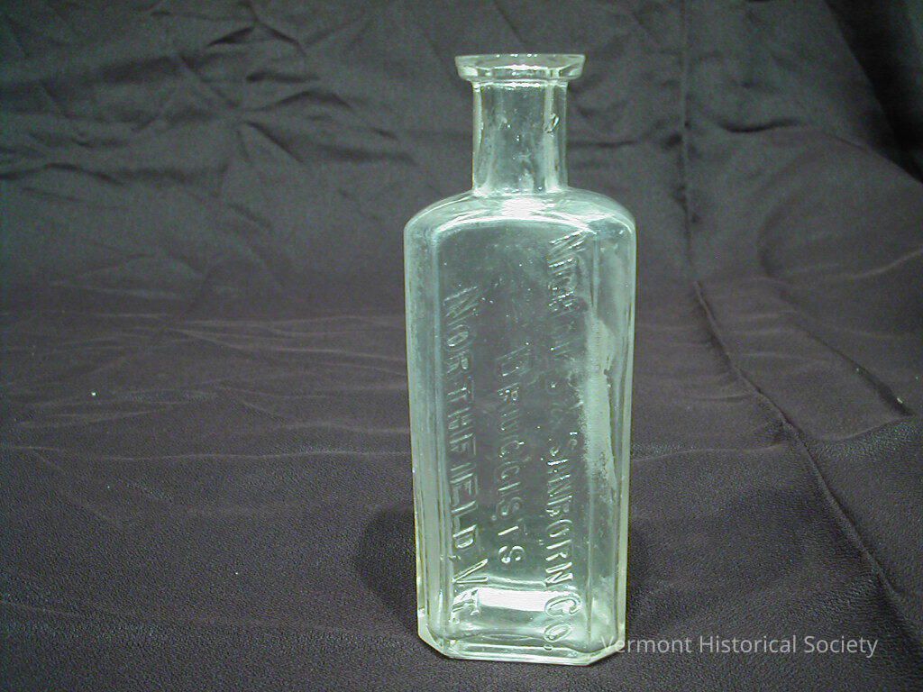 Clear glass medicine bottle with the molded inscription, "NICHOLS & SANBORN CO. DRUGGISTS NORTHFIELD, VT."