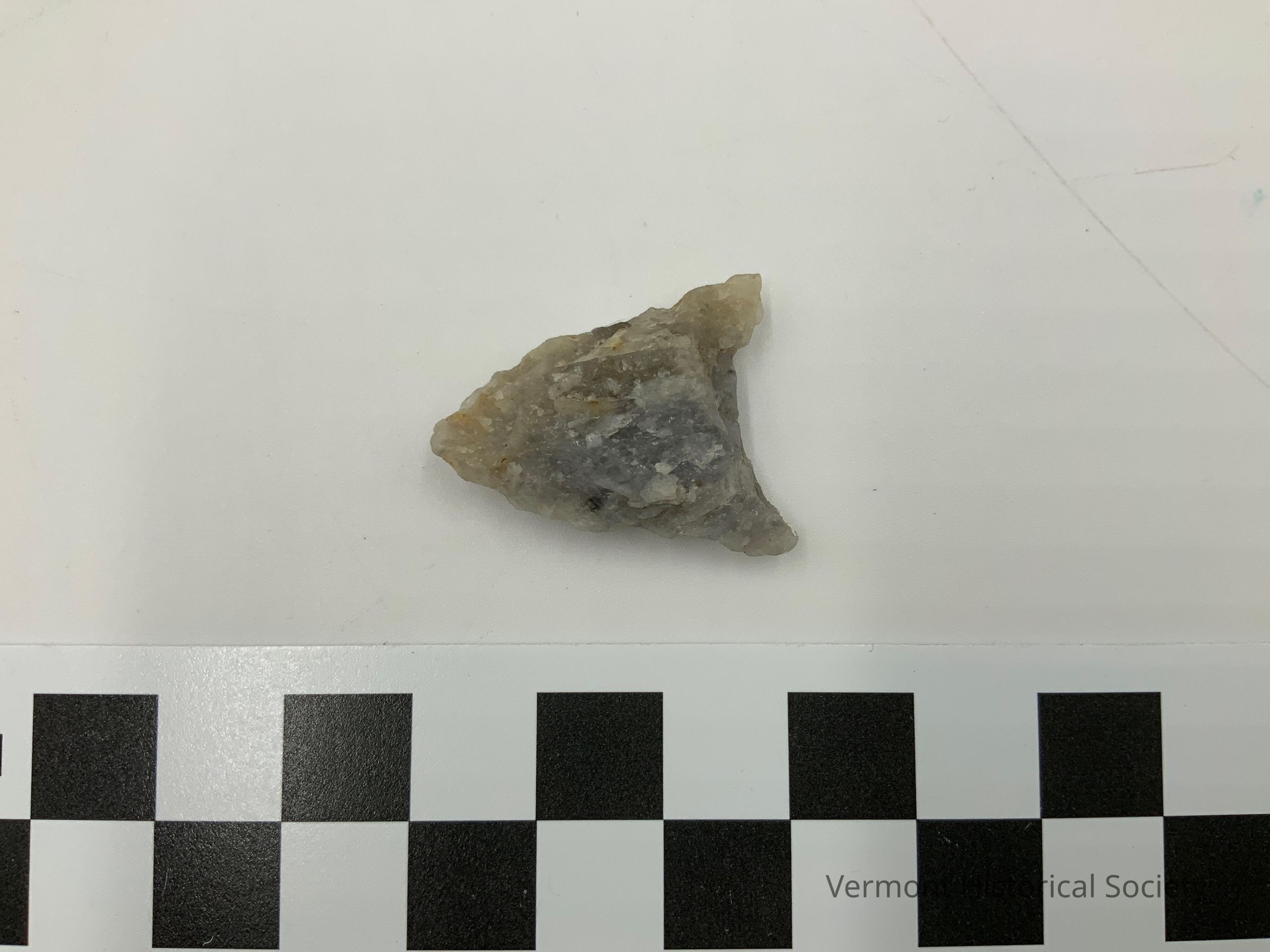 Triangular grey chipped stone projectile. One edge curves inward. The blade edges are serrated.
