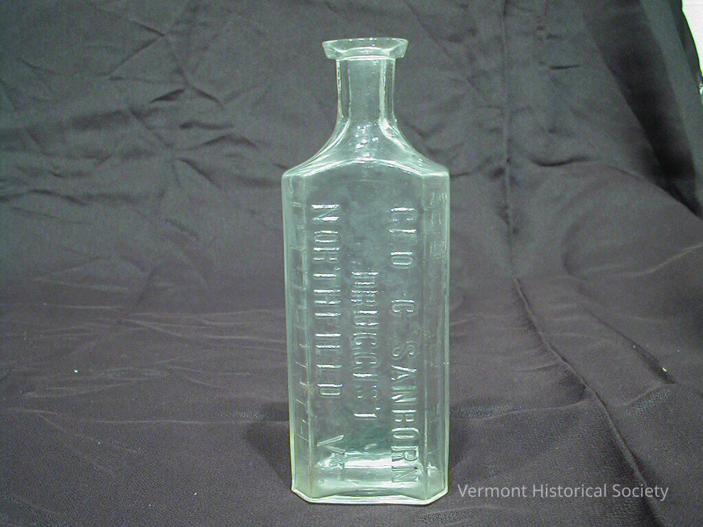 Clear glass medicine bottle with the molded inscription, "GEO. C. SANBORN/ DRUGGIST/ NORTHFIELD, VT." The sides has measurement lines going from 40-200 ccs on one side and 1-6 oz on the other.