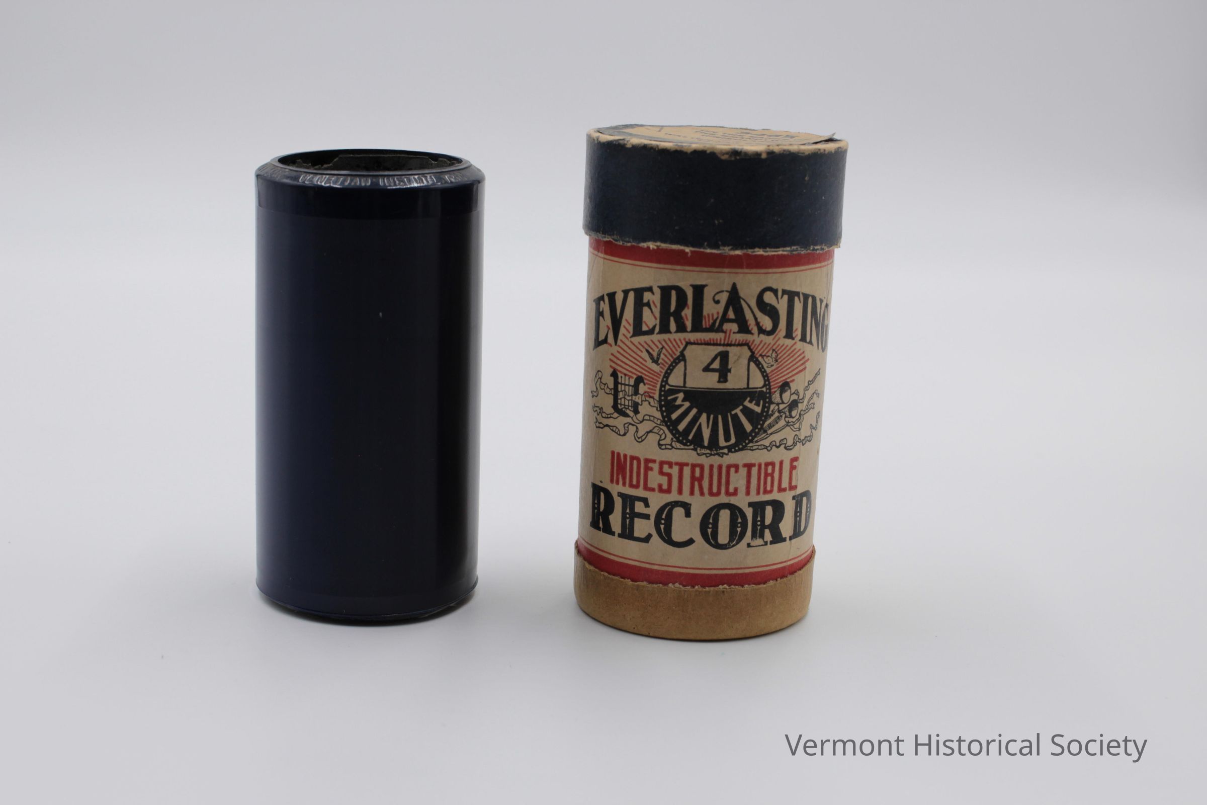 The cylinder is accompanied by a cardboard contain labeled, "EVERLASTING 4 MINUTE INDESTRUCTIBLE RECORD" on one side and "Fits all Standard Size Cylinder Machines / Greatest in Volume / Sweetest and Purest in Tone / Never Breaks / Never Wears Out".Use