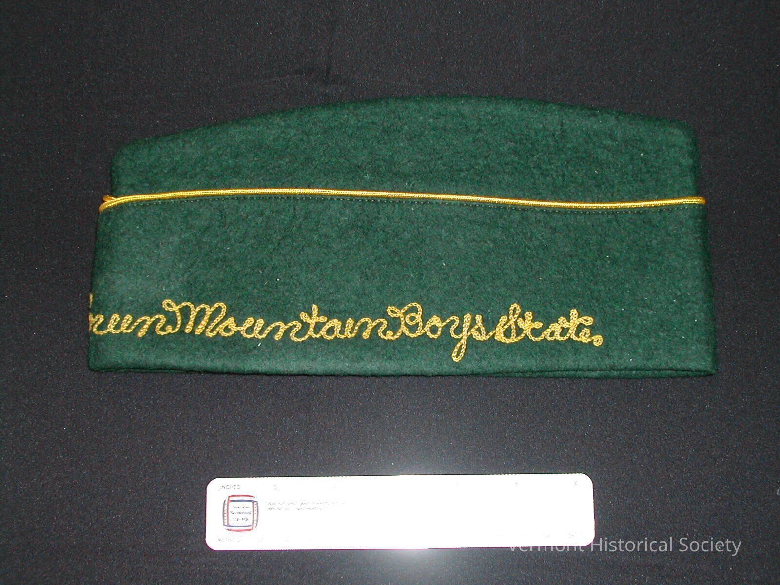 Green wool garrison cap. The brim is edged with yellow piping and embroidered with the words, "Green Mountain Boys State."