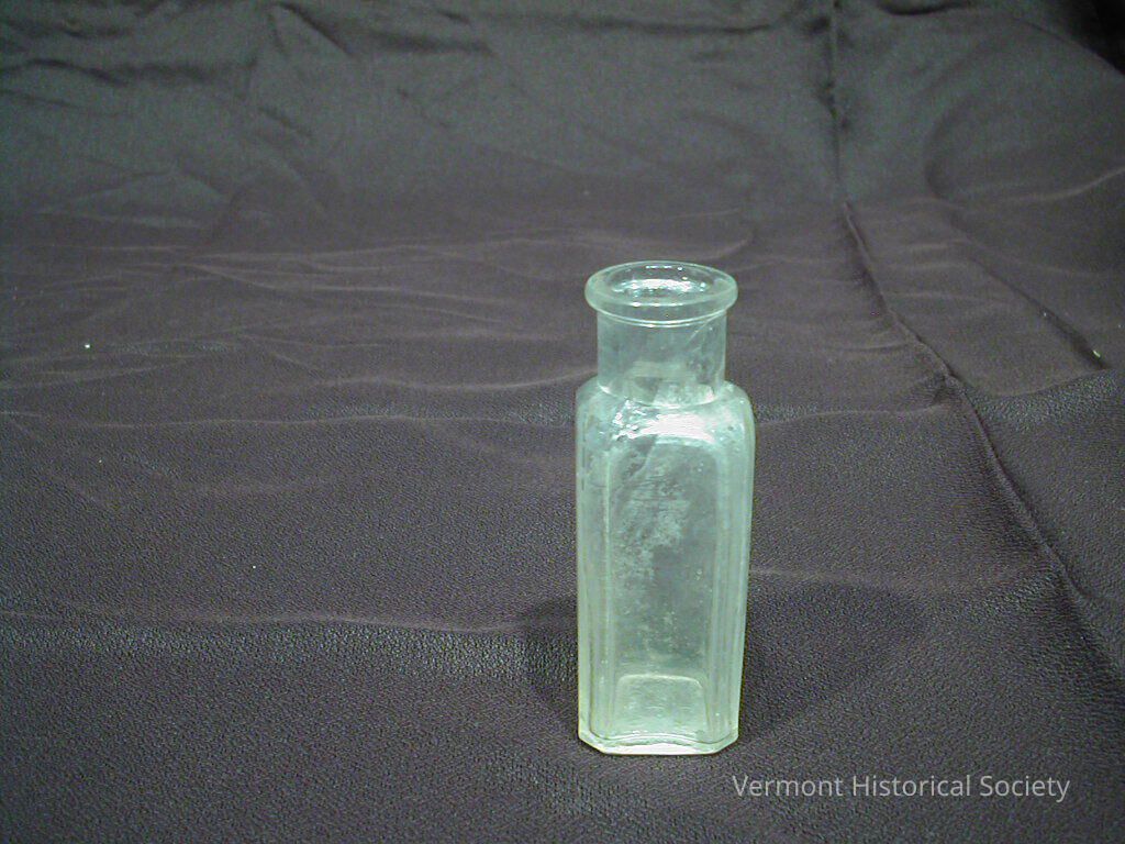 Clear glass medicine bottle with the molded inscription, "THE TRUDEL DRUG CO. LUCIEN J. TRUDEL RUTLAND, VERMONT"