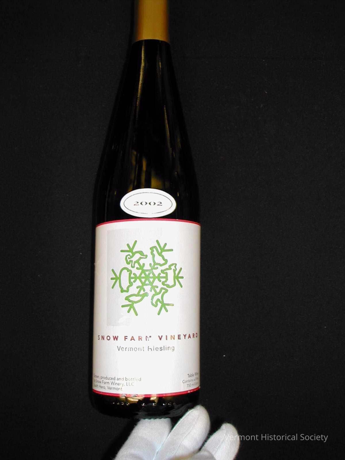 Wine bottle made of green glass- label is white with a stylized snowflake central that is superimposed over the profile of the state of VT. Each "arm" of the snowflake is an amimal shape. Below snowflake reads: "SNOW FARM WINERY / Vermont Reisling - (lower left corner)- Grown, produced and bottled/ by Snow Farm Winery, LLC/ South Hero, Vermont. (lower right corner) Table Wine/ Contains sulfites/ 750 milliters" Along edge is the wording from the "Government Warning...." Small oval label over main label reads: "2002"