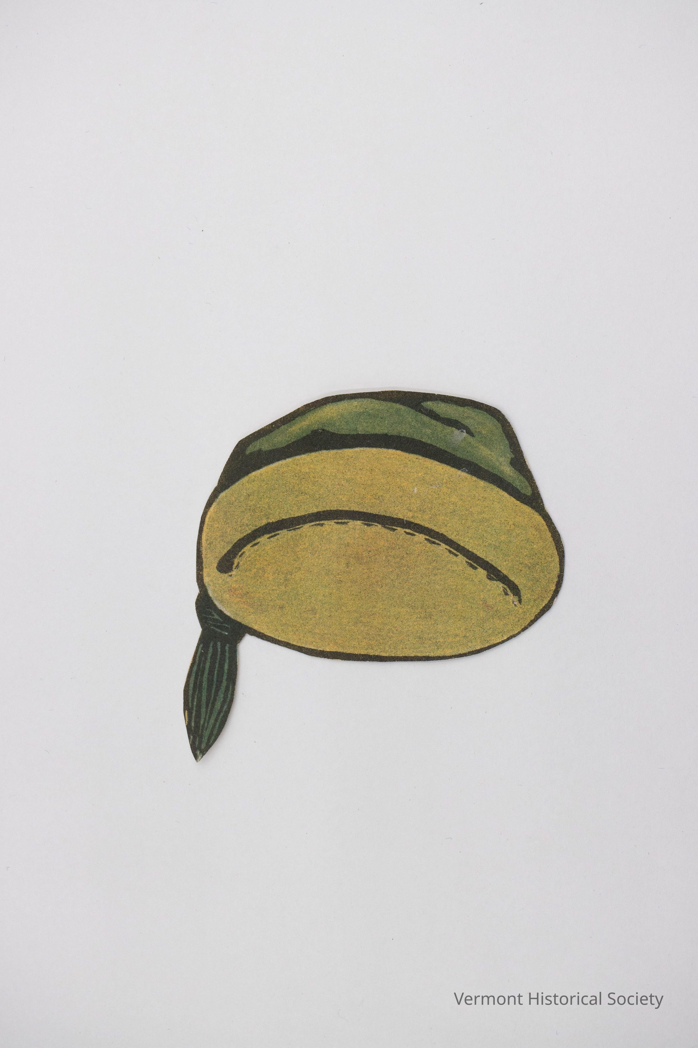 Green, printed paper hat for a paper doll. There is a green tassel on the left side. The back shows a portion of a sales catalog page.Context