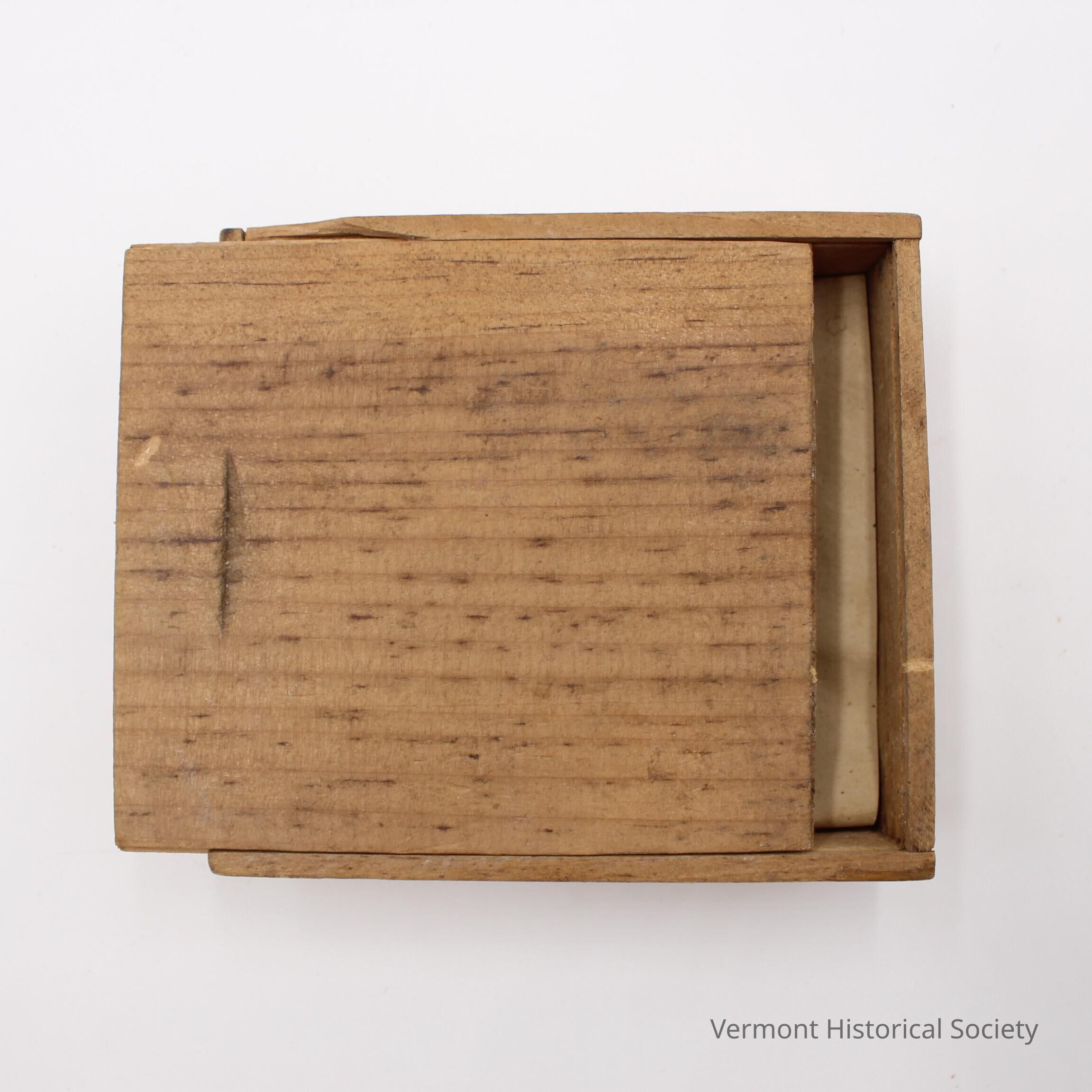 Small square box with a sliding lid and a stamp. The corners of the box are held with glued box joints. There is a small line carved into the end of the lid to grip while opening. There is a piece of paper inserted into the box.