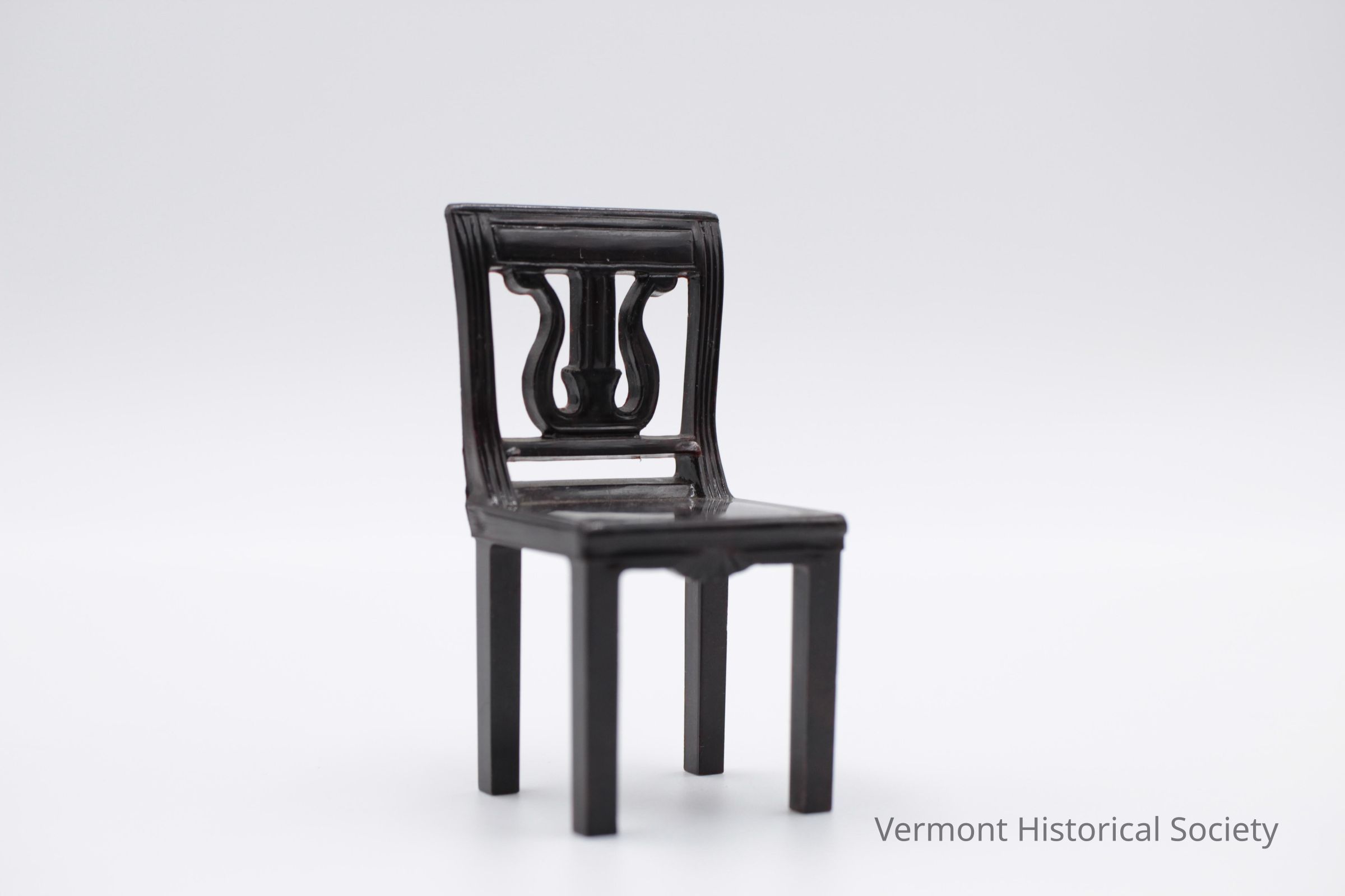 Miniature brown plastic side chair. The chair has straight, square legs and a square seat. The back has a lyre-shaped splat. The chair is part of a matching set of four.Context