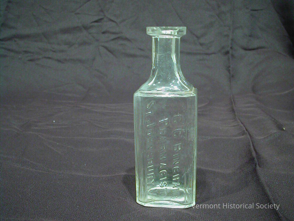 Clear glass bottle with the molded inscription, "C.C. BINGHAM PHARMACIST ST. JOHNSBURY, VT".