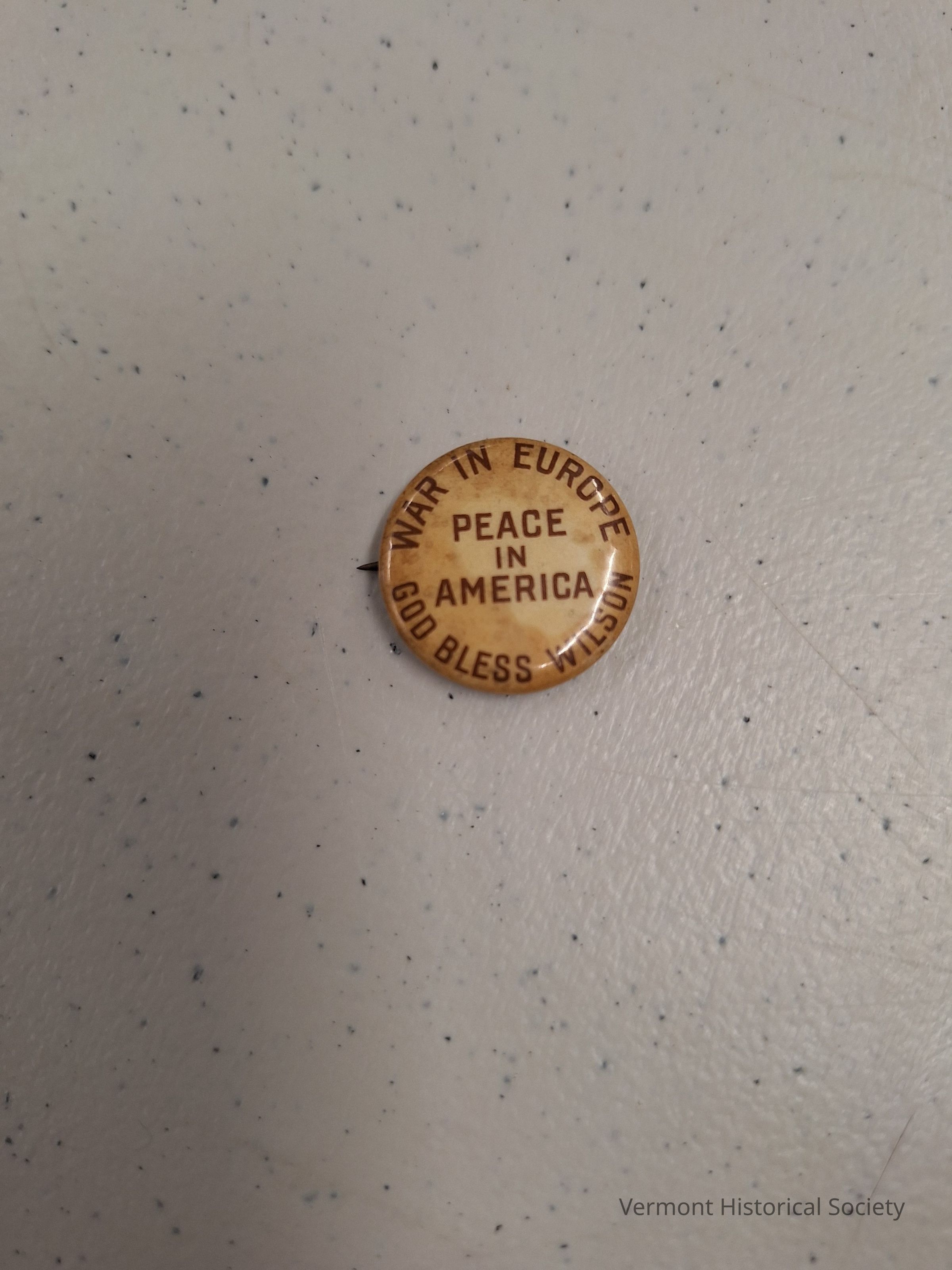 Formerly a white button, now stained, with red lettering that says, "War in Europe, Peace in America, God Bless Wilson."Context