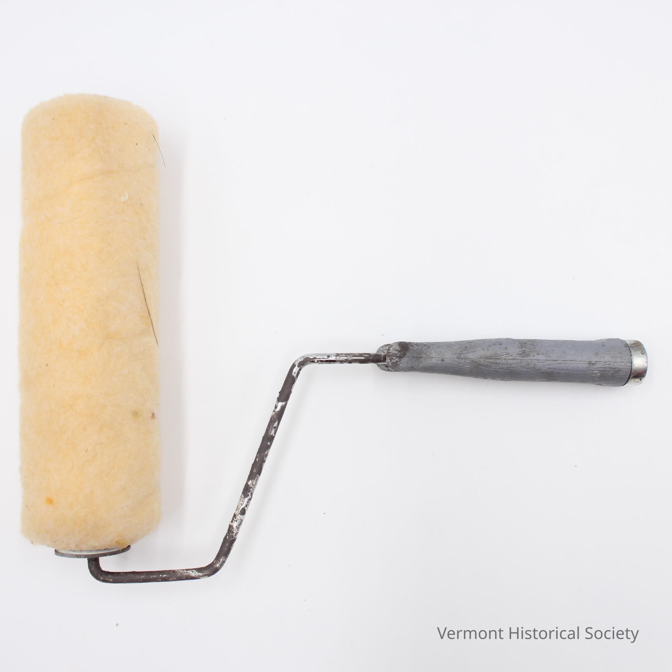 Paint roller on metal handle. The roller is peach-colored fibers attached to a cardboard roll. The roll is slid onto a mental paint roller handle with a plastic grip.Context