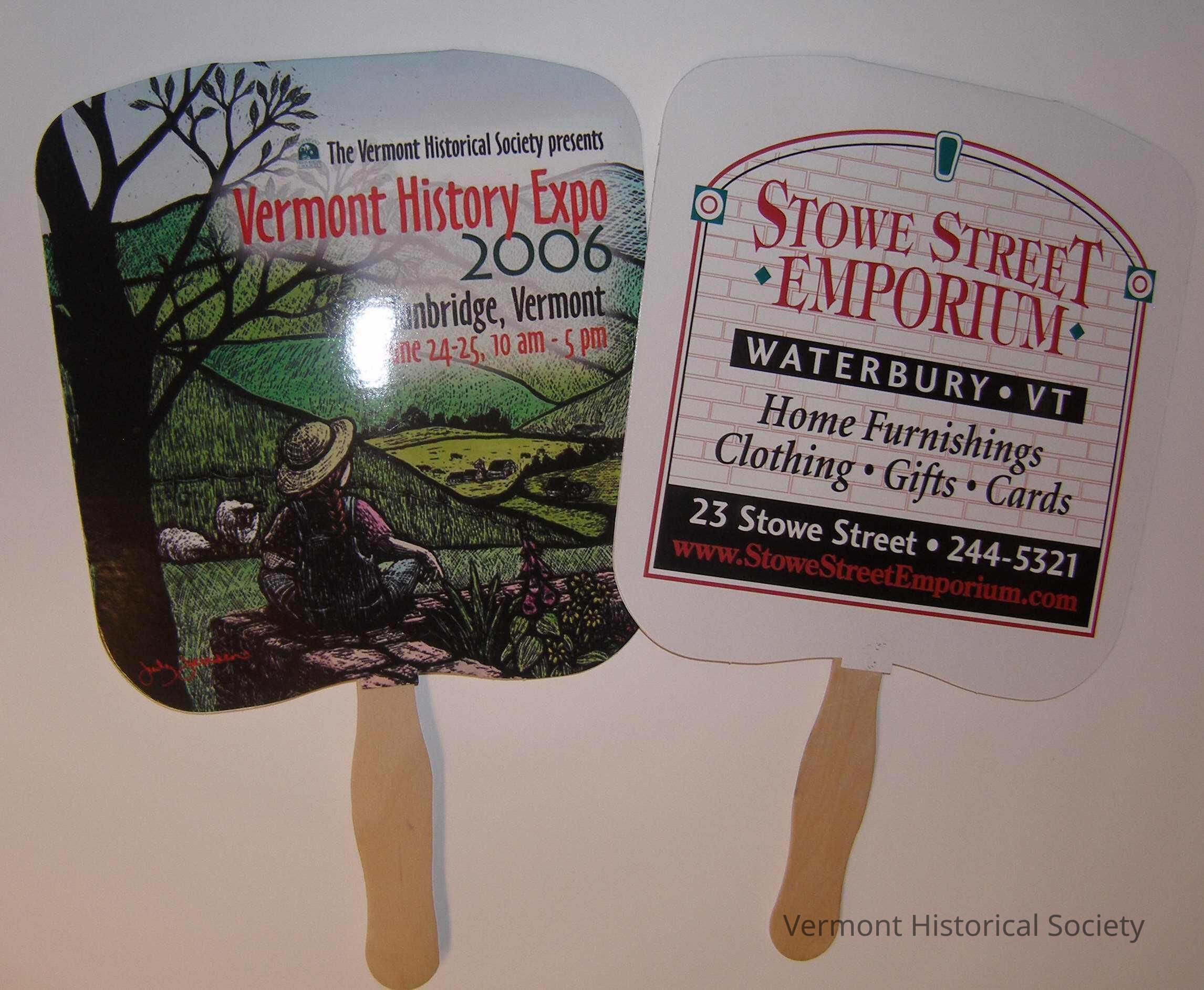 Hand fan printed on one side with a full-color illustration of a child sitting on a stone wall looking at green hill with the inscription, "The Vermont Historical Society presents Vermont History Expor 2006 Tunbridge, Vermont June 24-25, 10 am - 5 pm". The other side is printed with a brick pattern and the inscription, "Stowe Street Emporium WATERBURY VT Home Furnishings Clothing Gifts Cards 23 Stowe Street 244-5321 www.StoweStreetEmporium.com". There is a flat wooden stick extending from the bottom of the fan.