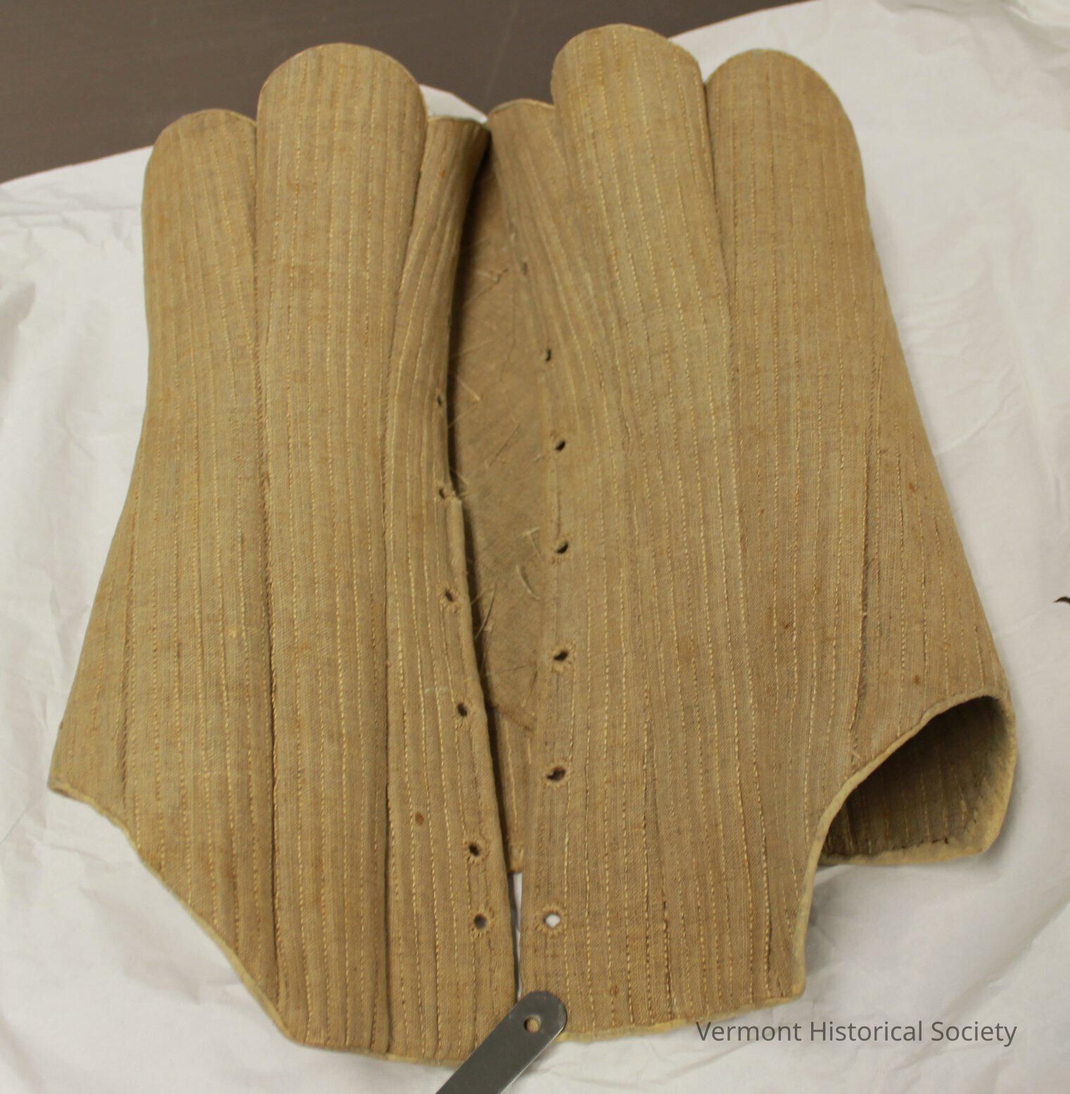 Unlined linen stays. The stays are fully boned with baleen and have eyelets along the center back opening for tying onto the wearer's body. There are no should straps. It has a high back and a scalloped hem. When closed, the stays create a conical shape, with the lowest point at the center front. The edges are bound with leather.
