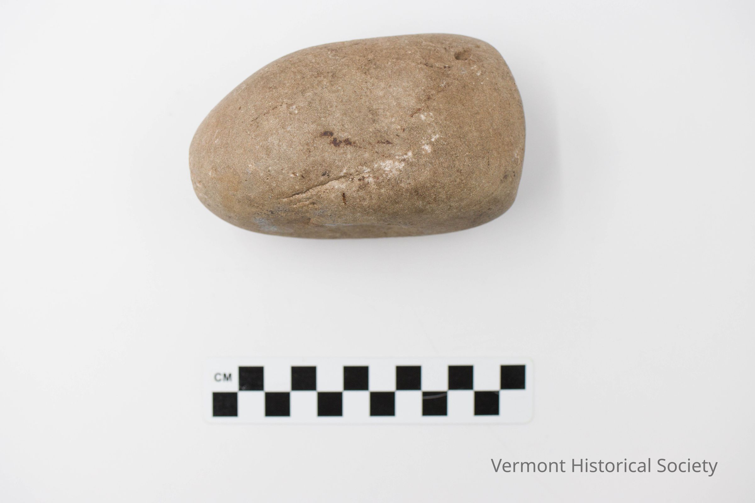 Naturally shaped grinding stone. One end is ground smooth from use, and the other end is slightly battered.