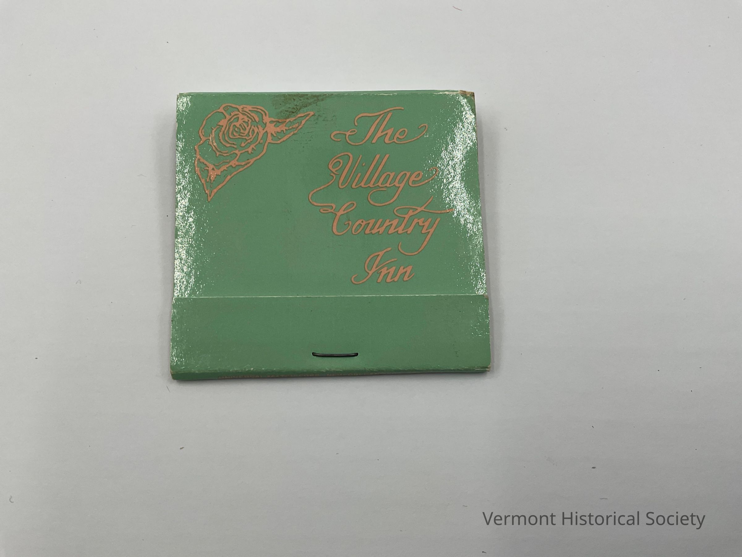 Green matchbook with pink image of a rose and scripted letters that says, "The Village Country Inn." At the bottom of the front flap is a warning, " Be safe. Close cover before striking." On the back: " A Country French Inn, HIstoric Route 7A, P.O. Box 408, Manchester Village, Vermont, 05254, (802) 362-1792." The manufacturer is "Universal Match Corp., New Orleans, 504-464-9611." There are white-tipped matches.Context