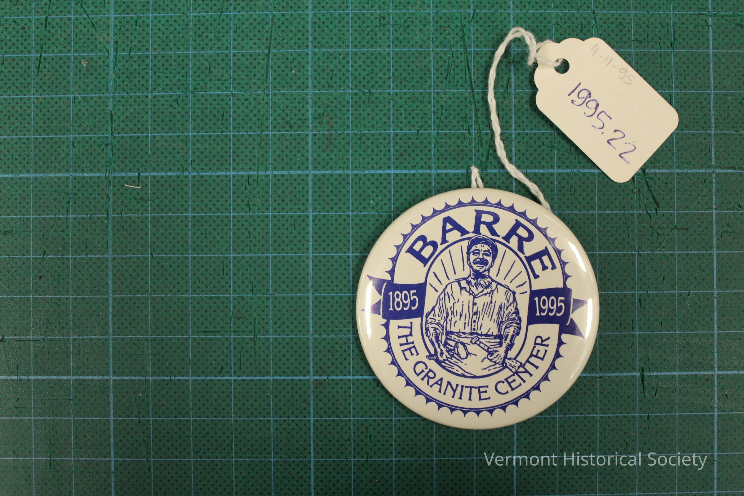 Barre/ The Granite Center 1895-1995 pin. White pin with blue graphics of a male granite cutter with tools in hand central. Around him is an oval of text "1895 BARRE 1995 THE GRANITE CENTER" With a safety clasp pin back.Context