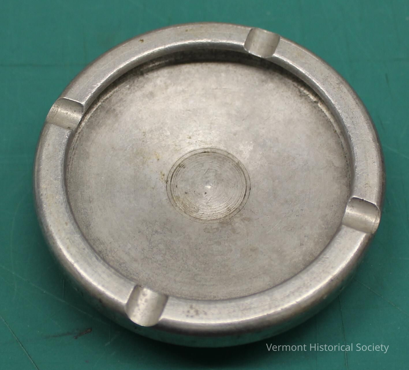 Ashtray. It is made of silver-tone metal and has a round shape with a short pedestal base. It has four notches that can hold cigarettes. The edge of the ashtray is labeled "CONE AUTOMATIC MACHINE COMPANY / WINDSOR VERMONT".