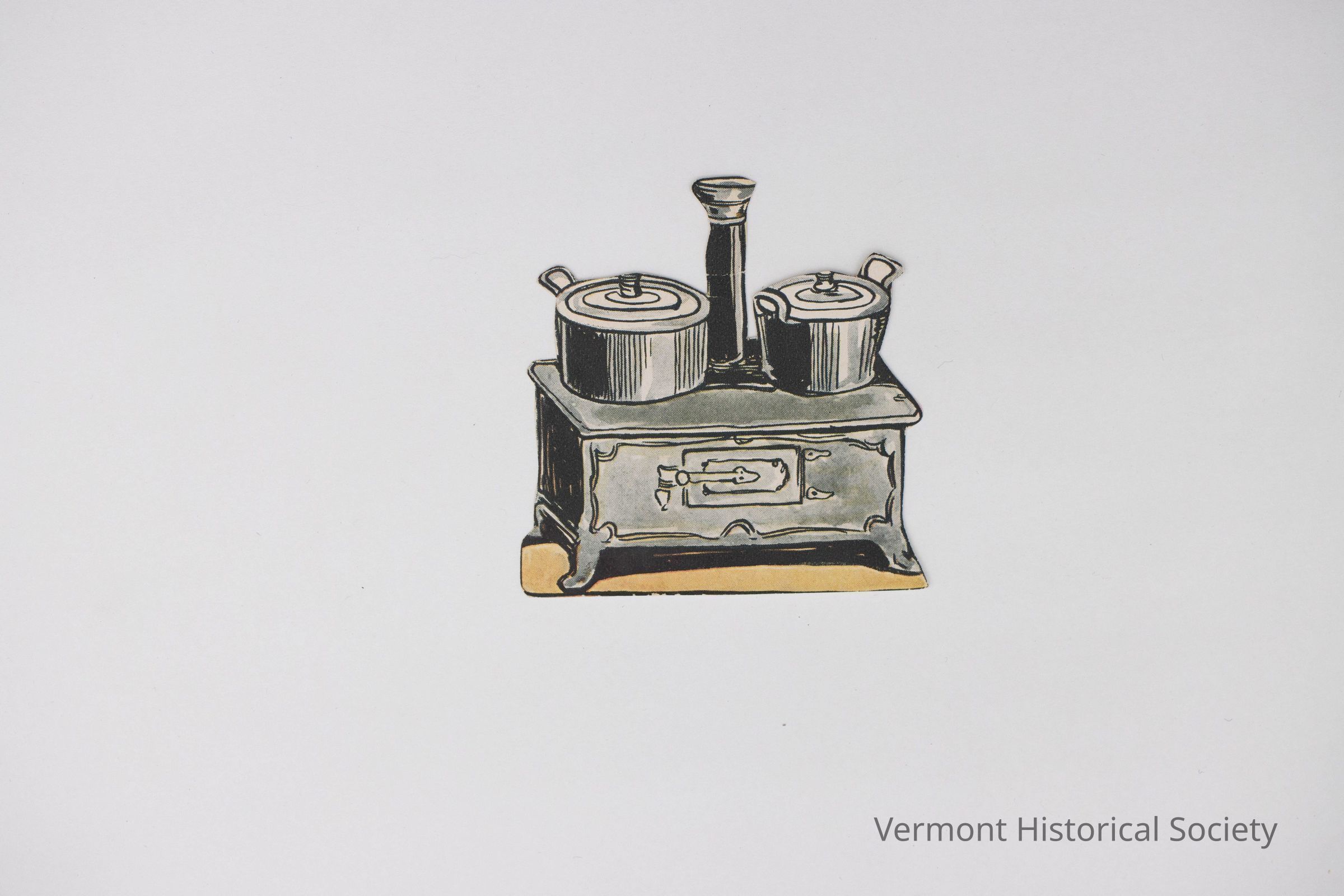 Paper doll accessory showing a cookstove with two pots on it. The back shows a portion of a page of a magazine.Context