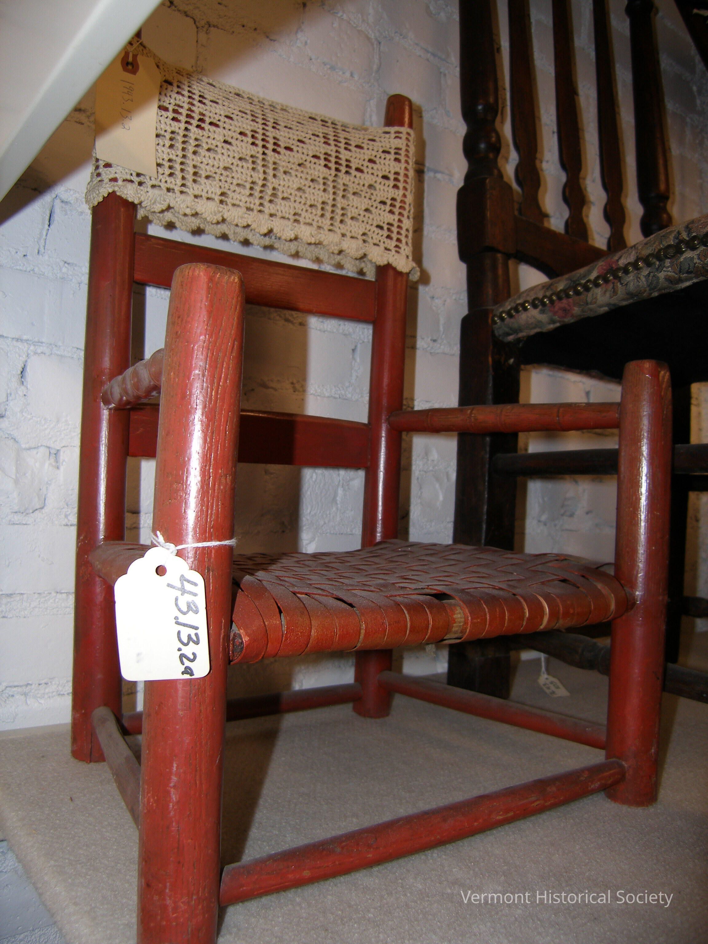 Diminutive, red-painted wooden ladder-back chair, sized for a child. There is a crocheted antimacassar at the top of the chair back, covering the highest rail. The seat is woven cane.Context