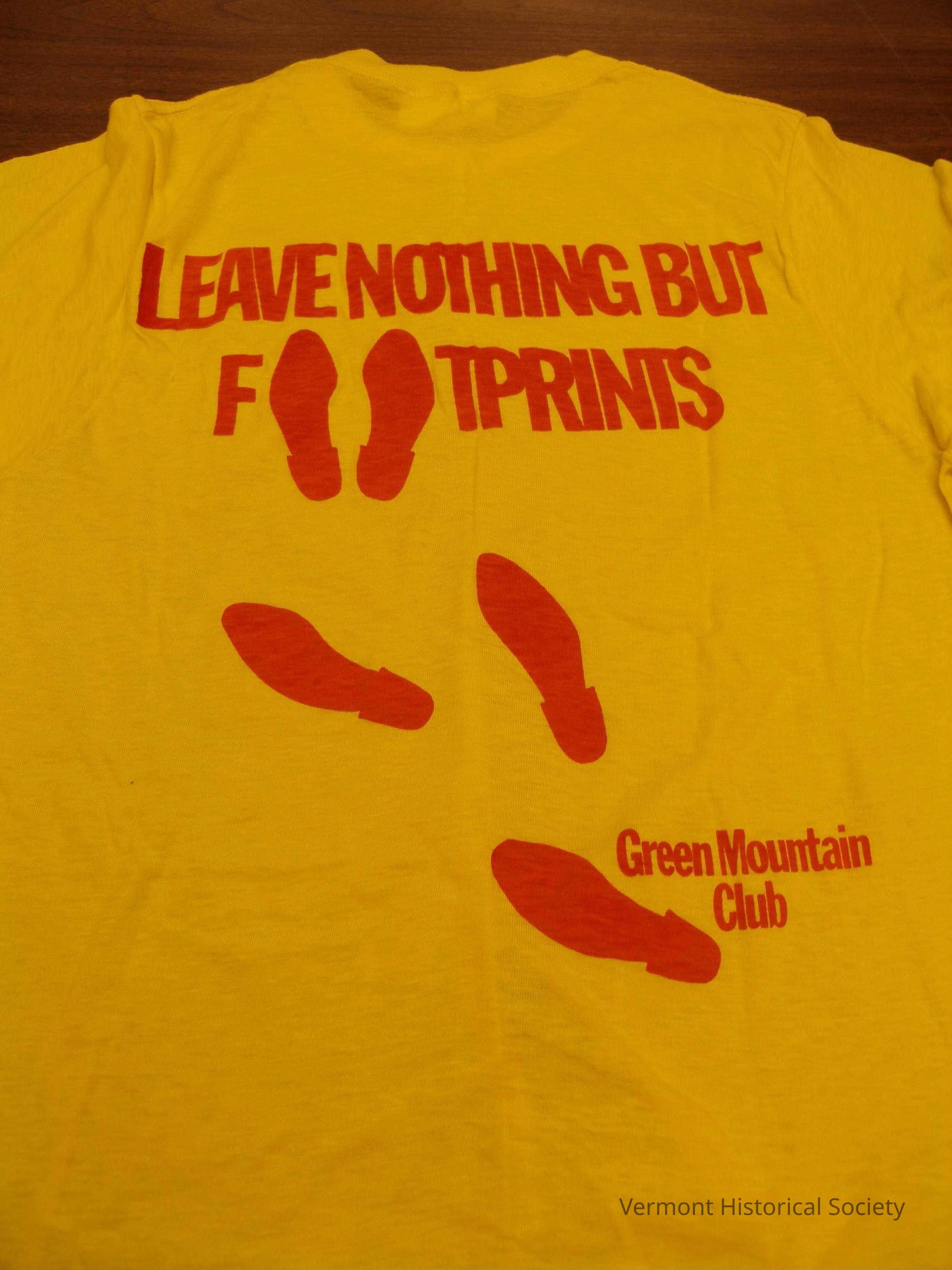 Yellow cotton t-shirt printed on the back in red with the words, "LEAVE NOTHING BUT FOOTPRINTS / Green Mountain Club". There are footprints up the shirt and forming the two Os within the word footprints.