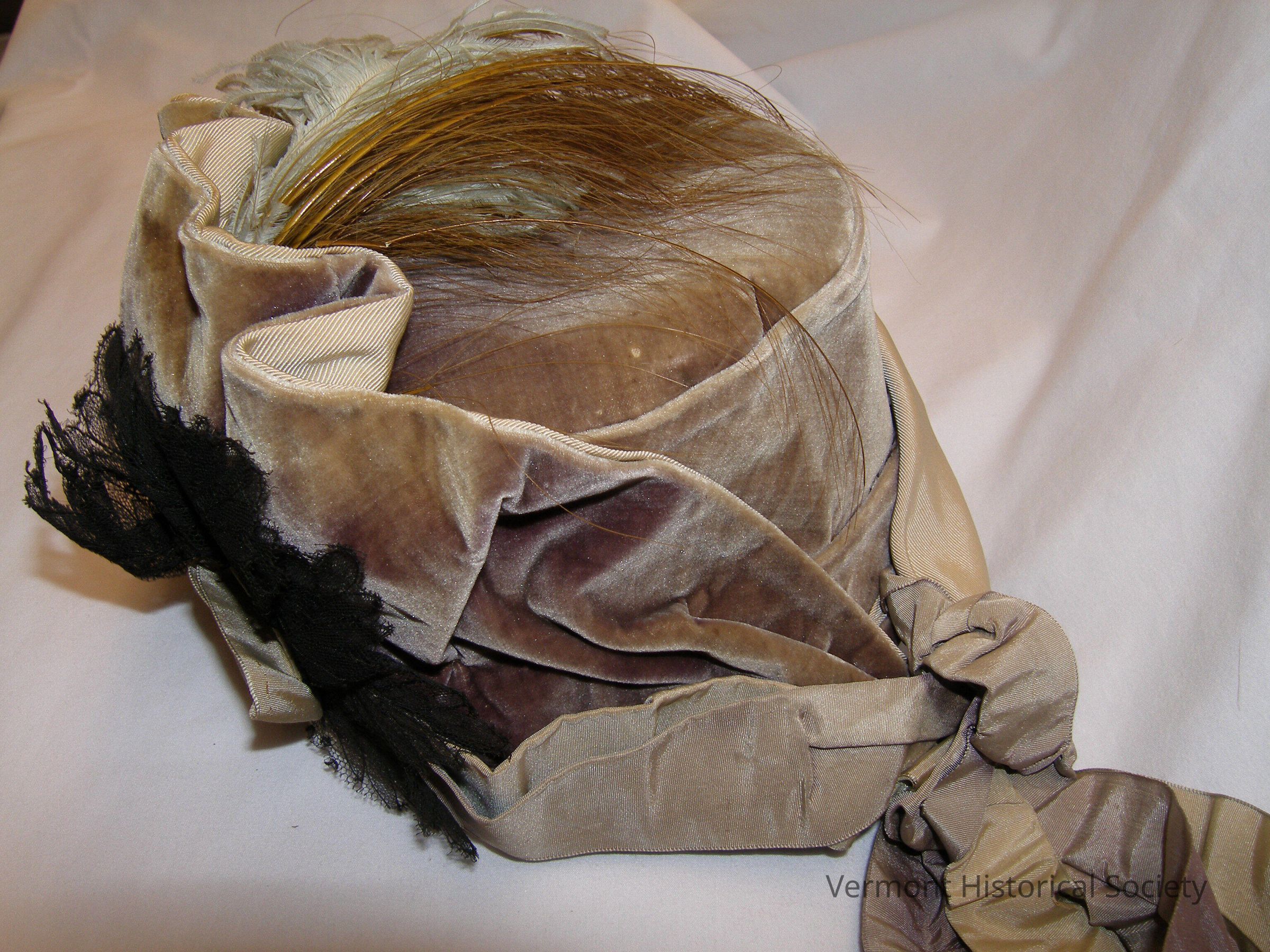 Bonnet covered with olive green silk velvet. The brim is decorated with pleats of self fabric lined in corded silk taffeta. It is embellished with ostrich feathers and black lace. The interior of the brim is decorated with pleated cream-colored silk. There are two wide velvet bands that hang from the center back, and two silk ribbons that tie under the wearer's chin.Context