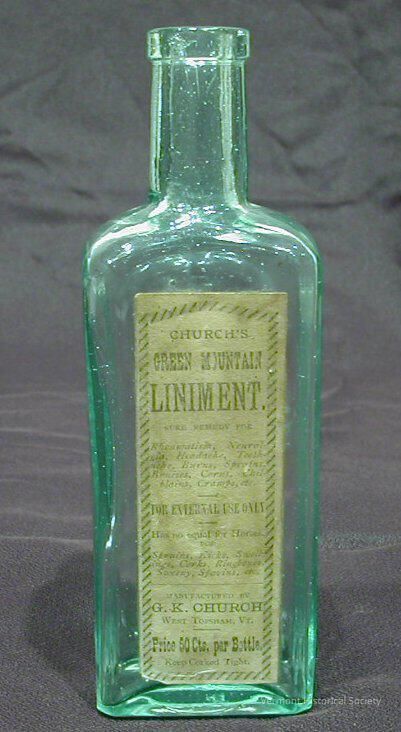 Green medicine bottle with a paper label that reads, "CHURCH'S GREEN MOUNTAIN LINIMENT. SURE REMEDY FOR Rheumatism, Neuralgia, Headache, Toothache, Burns, Sprains, ... FOR EXTERNAL USE ONLY... MANUFACTURED BY G.K. CHURCH ... Price 50 Cts. per Bottle. Keep Corked Tight." The other side has the molded inscription, "G.K. CHURCH'S GREEN MOUNTAIN LINIMENT WEST TOPSHAM, VT."Context