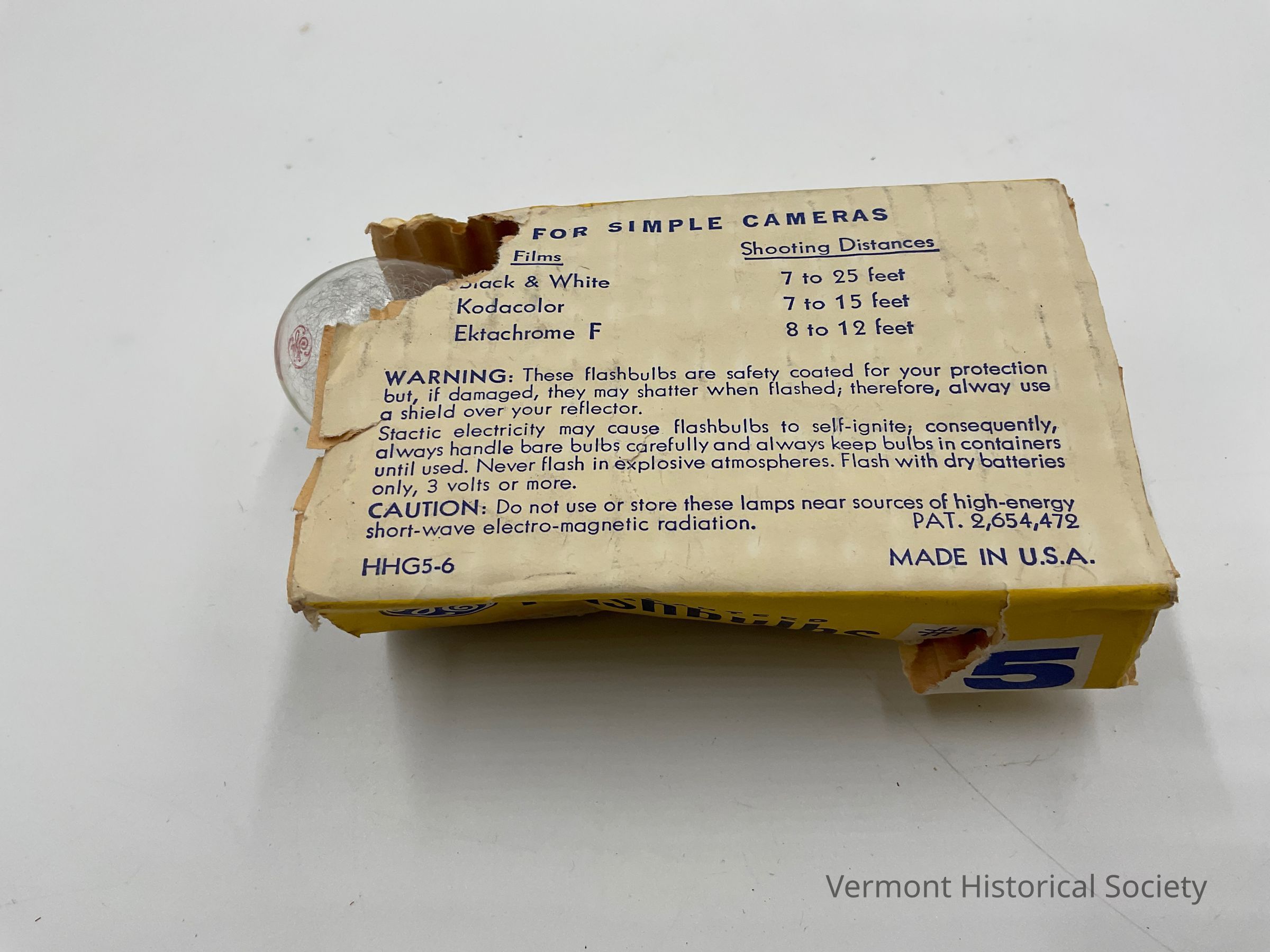 Ripped yellow and white box of #5 flashbulbs manufactured by General Electric Co. The package contains only two flashbulbs although it was made to contain four bulbs to be used in a camera flash attachment.