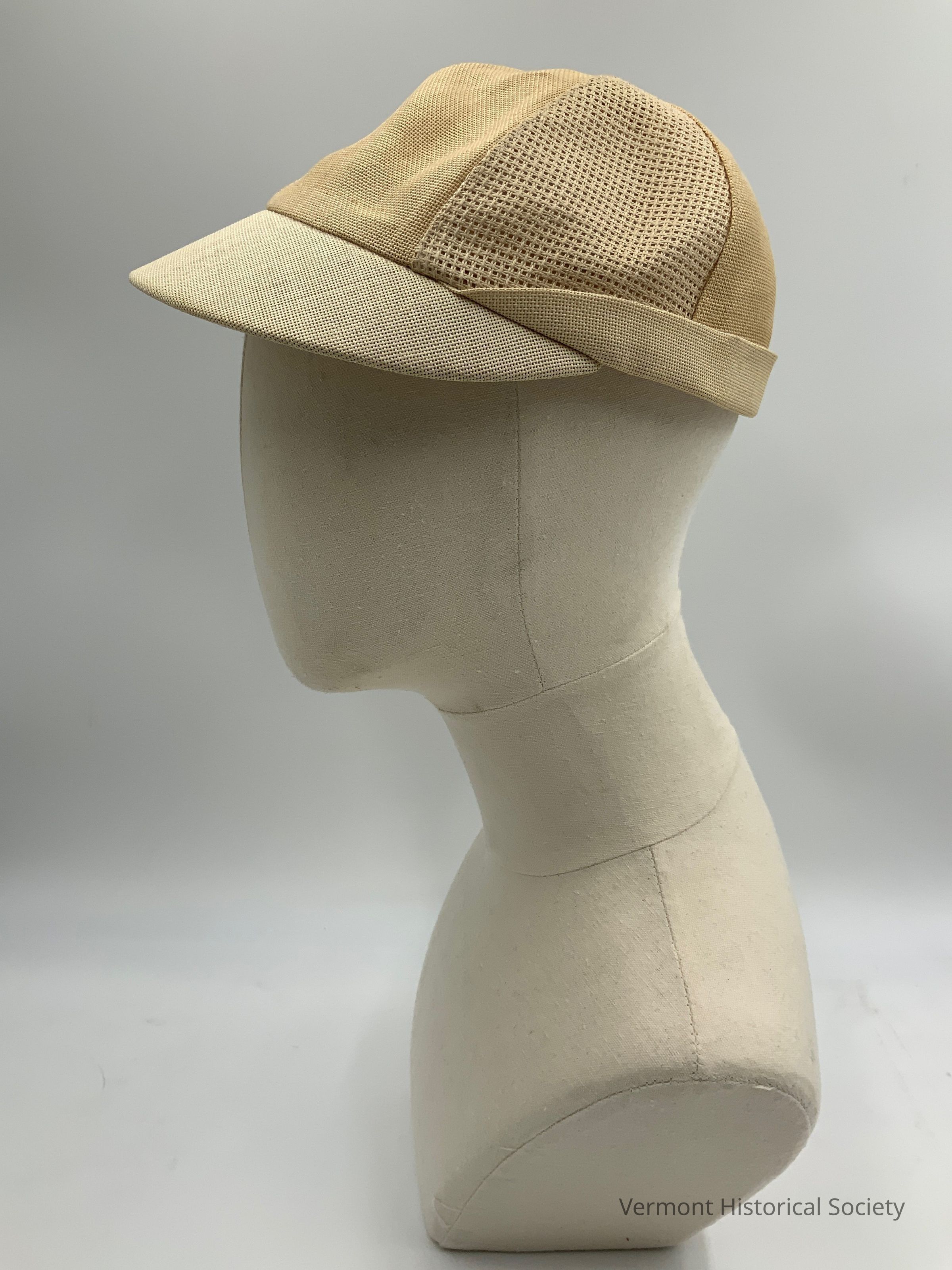 Straw cap with a rounded front brim. The crown is formed from 6 wedges with alternating weave structures. There is a short, turned up tail around the back of the crown. A tag on the interior reads, "Hadson Size Medium".