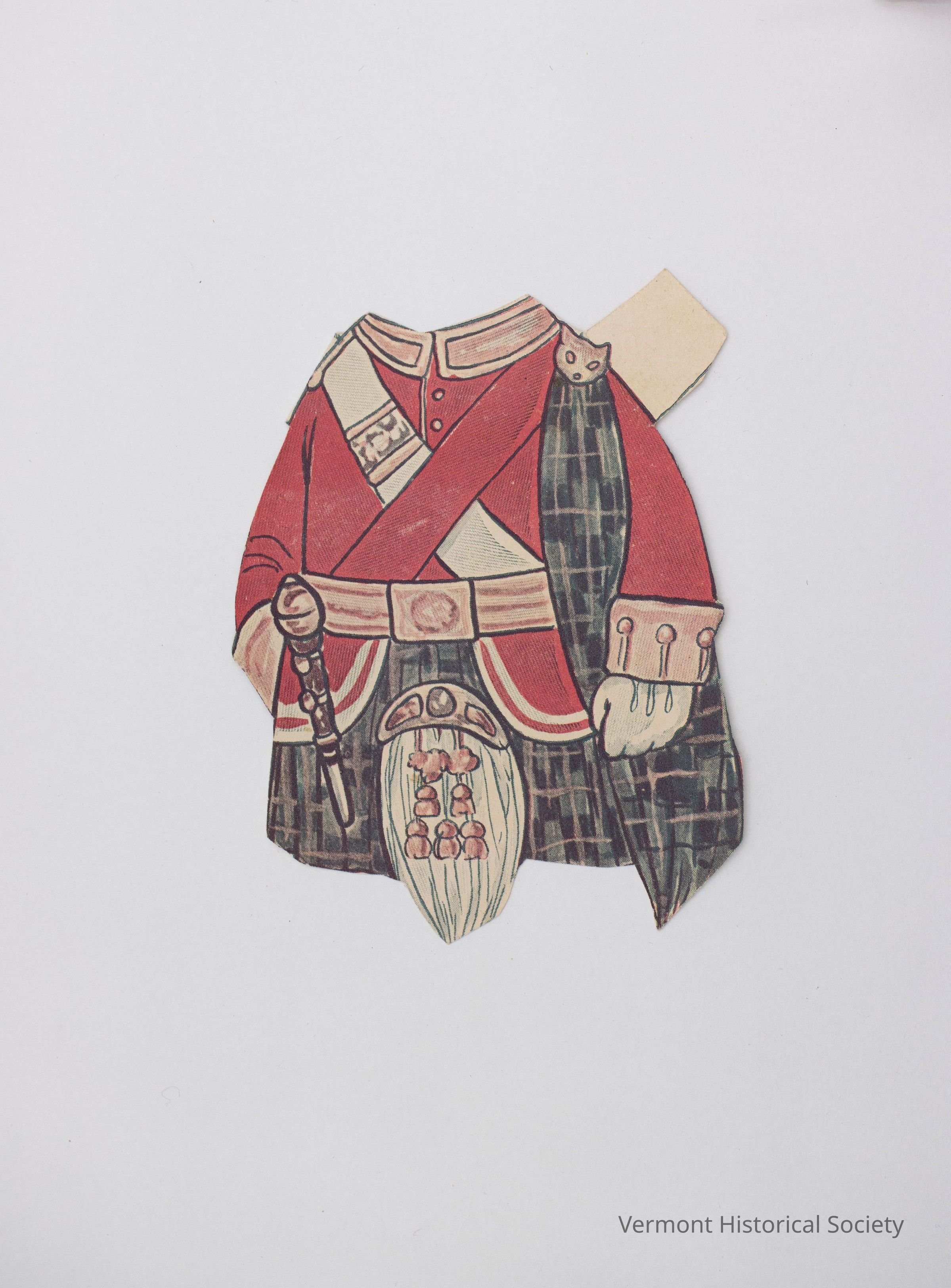 Printed paper Scottish costume for a paper doll. The suit consists of a red coat with a green plaid kilt and sash. The back shows a portion of a sales catalog page and the handwritten label, "totty".Context