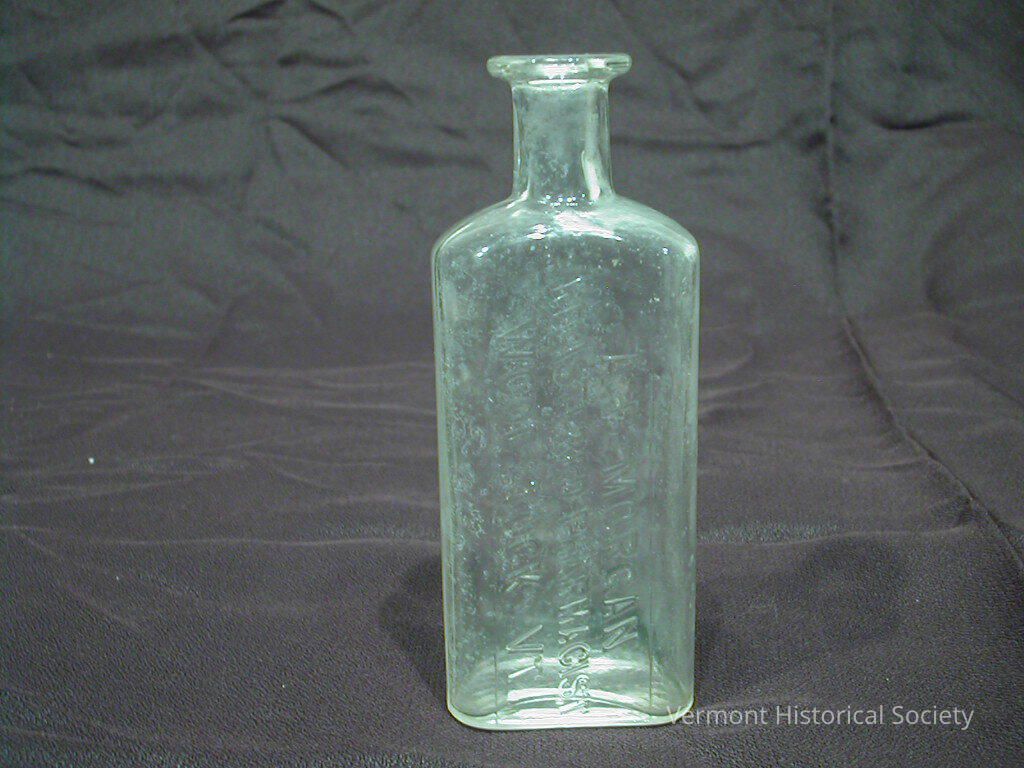 Clear glass bottle with the molded inscription, "A.B. MORGAN REGISTERED PHARMACIST WOODSTOCK, VT."