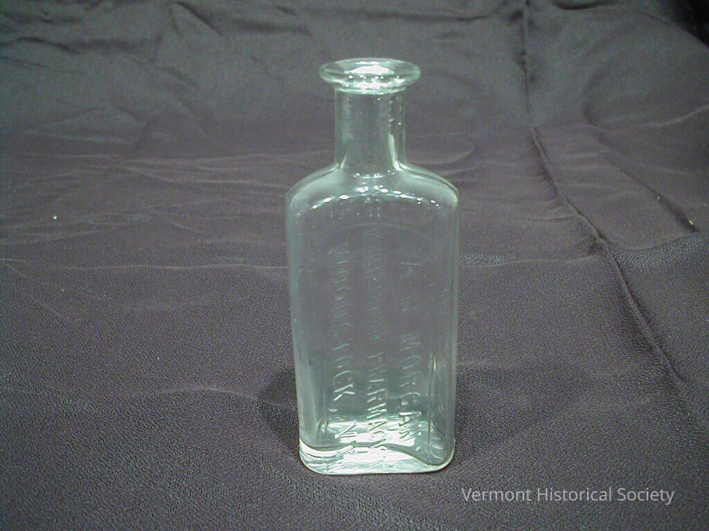 Clear glass bottle with the molded inscription, "A.B. MORGAN/ REGISTERED PHARMACIST/ WOODSTOCK, VT." The shoulder is marked, "ii".