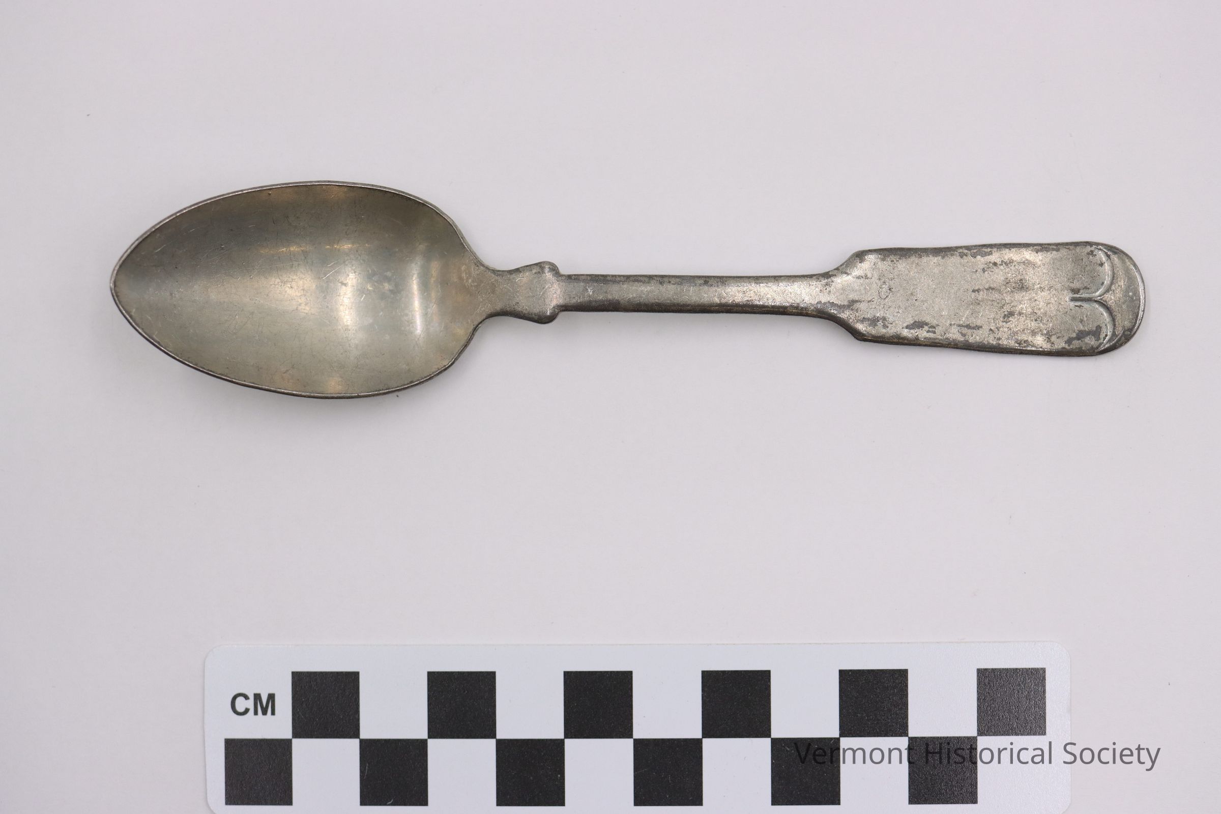 Tin-plated teaspoon. The back of the handle is marked, "MADE IN U.S.A. / 900 W.R W".