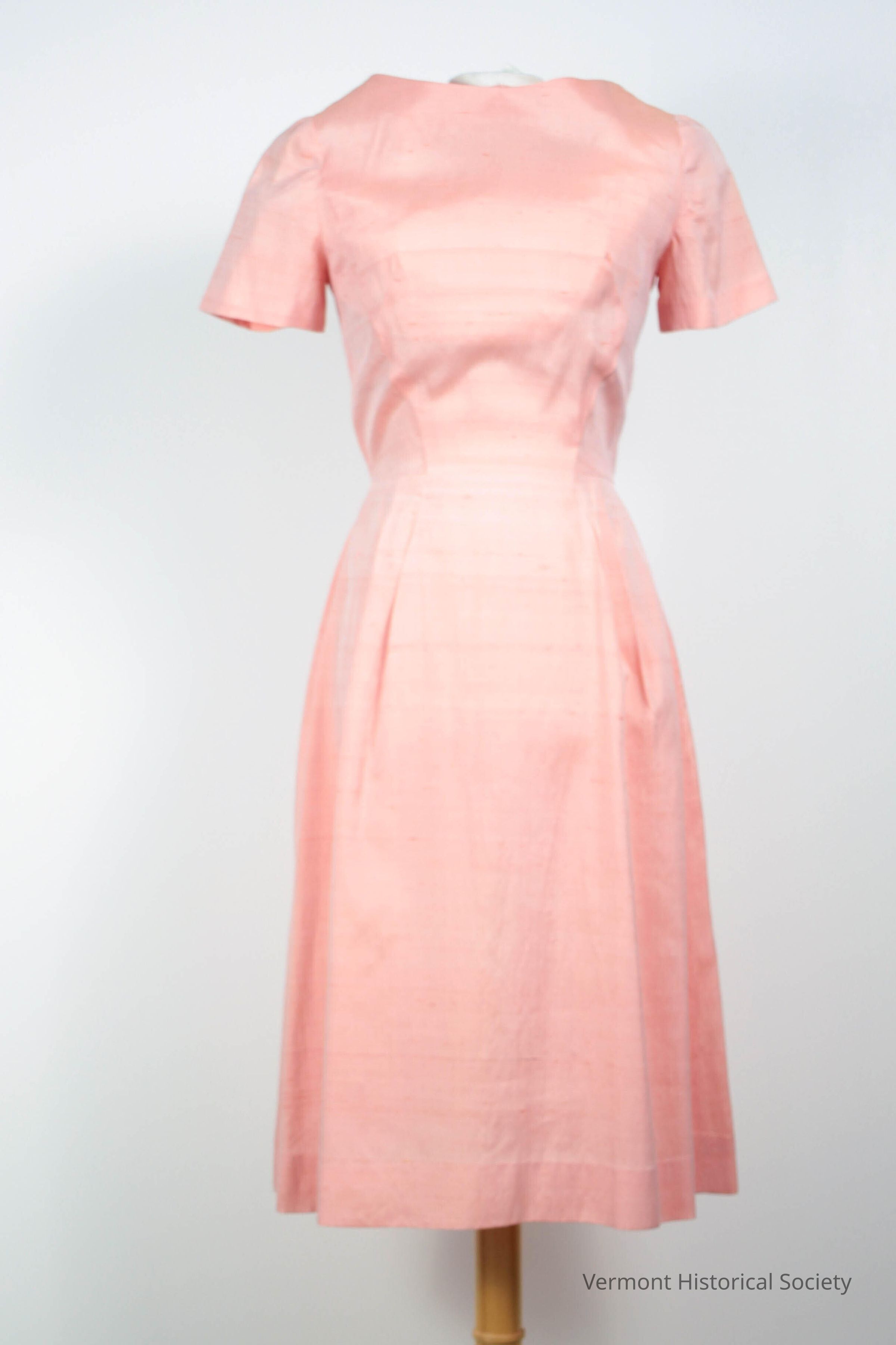 Short-sleeved, pink shantung dress. The bodice has a boat neckline and structure sleeves. The skirt is pleated at the front sides, with the pleats aligning with the bodices princess seams. The dress opens up the center back with a zipper.Context